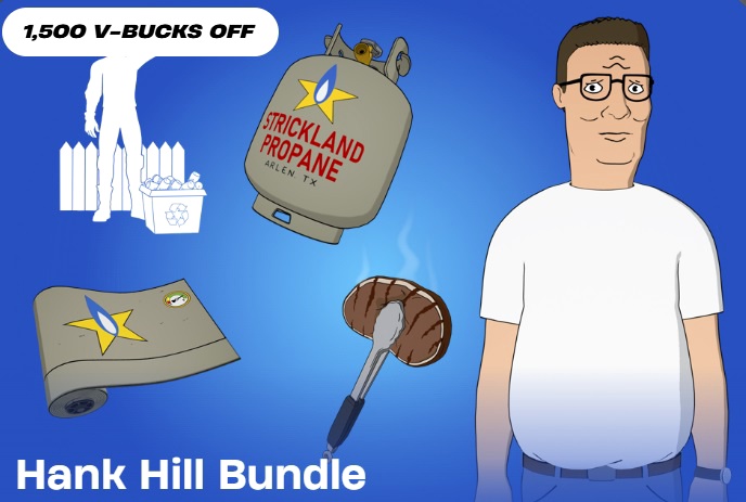 With a 1,500 V-Buck savings, the Hank Hill Bundle includes the Hank Hill costume, Sirloin’d Tongs Pickaxe, Alley Hangout emote, Strickland Propane Tank backbling, and Gas Gauge wrap.