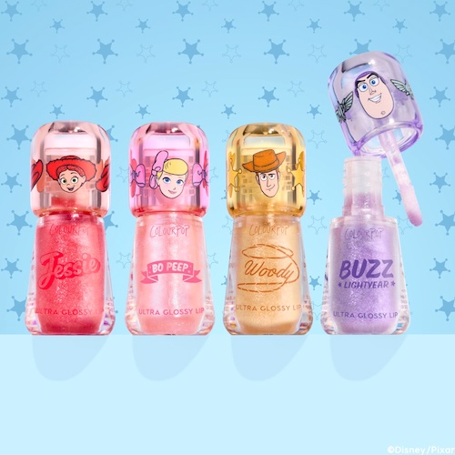 - Ultra Glossy Lips - A sheer hi-shine gloss infused with Hyaluronic Acid in a pearlized finish for hydrated, glossy lips that don’t feel sticky. Inspired by Toy Story’s Woody, Buzz Lightyear, Bo Peep and Jessie. - $10 USD each