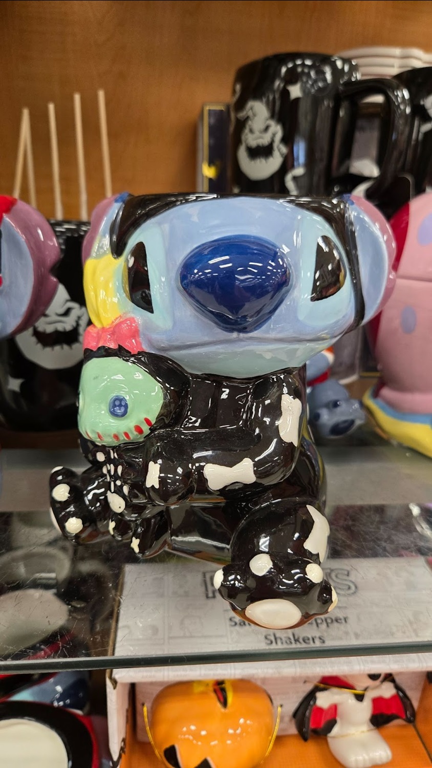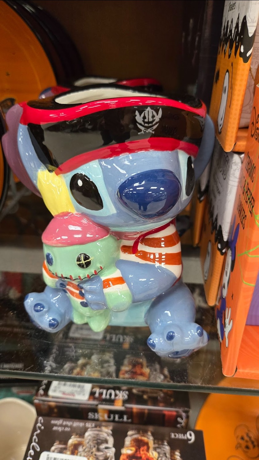 Two cute ceramic Stitch figures feature the adorable Experiment 626 as a pirate and a skeleton, holding Scrump. Both retail for $12.99.