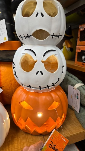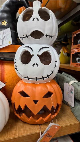A light-up trio of pumpkins begins at the bottom with a traditional pumpkin, with the two on top featuring Jack Skellington – available for $24.99.