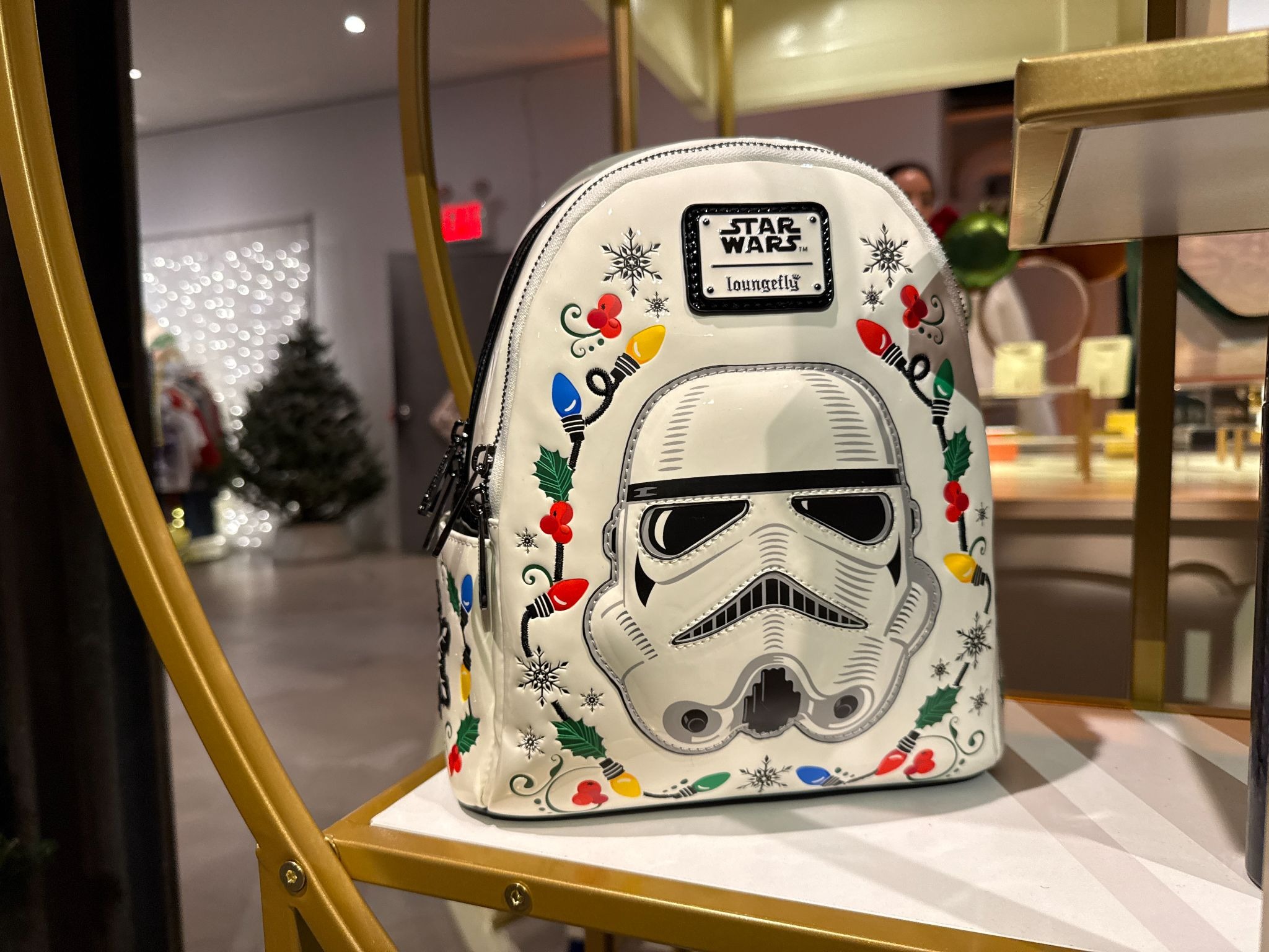 A galaxy far, far away gets its own dose of festive flair with the Loungefly Star Wars™ Stormtrooper Holiday Light-Up Mini Backpack ($90.00). This gleaming patent faux leather design centers on a Stormtrooper helmet wrapped in embroidered holiday lights—and yes, some of them actually light up. Appliqué snowflakes accent the straps, while side pockets carry extra seasonal details that make the whole look pop. Equal parts fandom and festivity, it’s the perfect accessory for Star Wars fans who like their style merry, bright, and slightly Imperial.