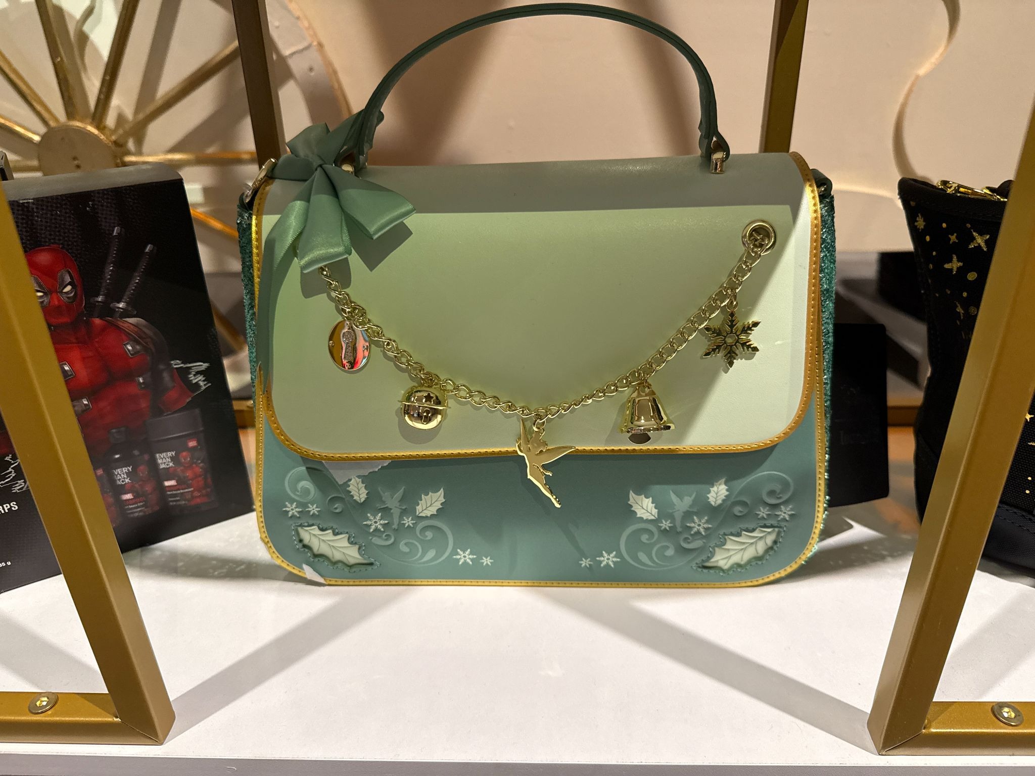 Closing out the display with a sprinkle of pixie dust, the Loungefly Tinker Bell Holiday Crossbody Bag ($75.00) captures the whimsy of Peter Pan’s beloved fairy in an elegant holiday design. Sequined side panels shimmer with every twinkle light, while the front features embossed leaf motifs, a satin bow, and a cluster of metal charms, including a keyhole, bell, thimble, star, and Tinker Bell herself. Delicate yet festive, it’s a charming statement piece that pairs easily with dressy looks or cozy sweaters—proof that holiday sparkle can be as refined as it is magical.