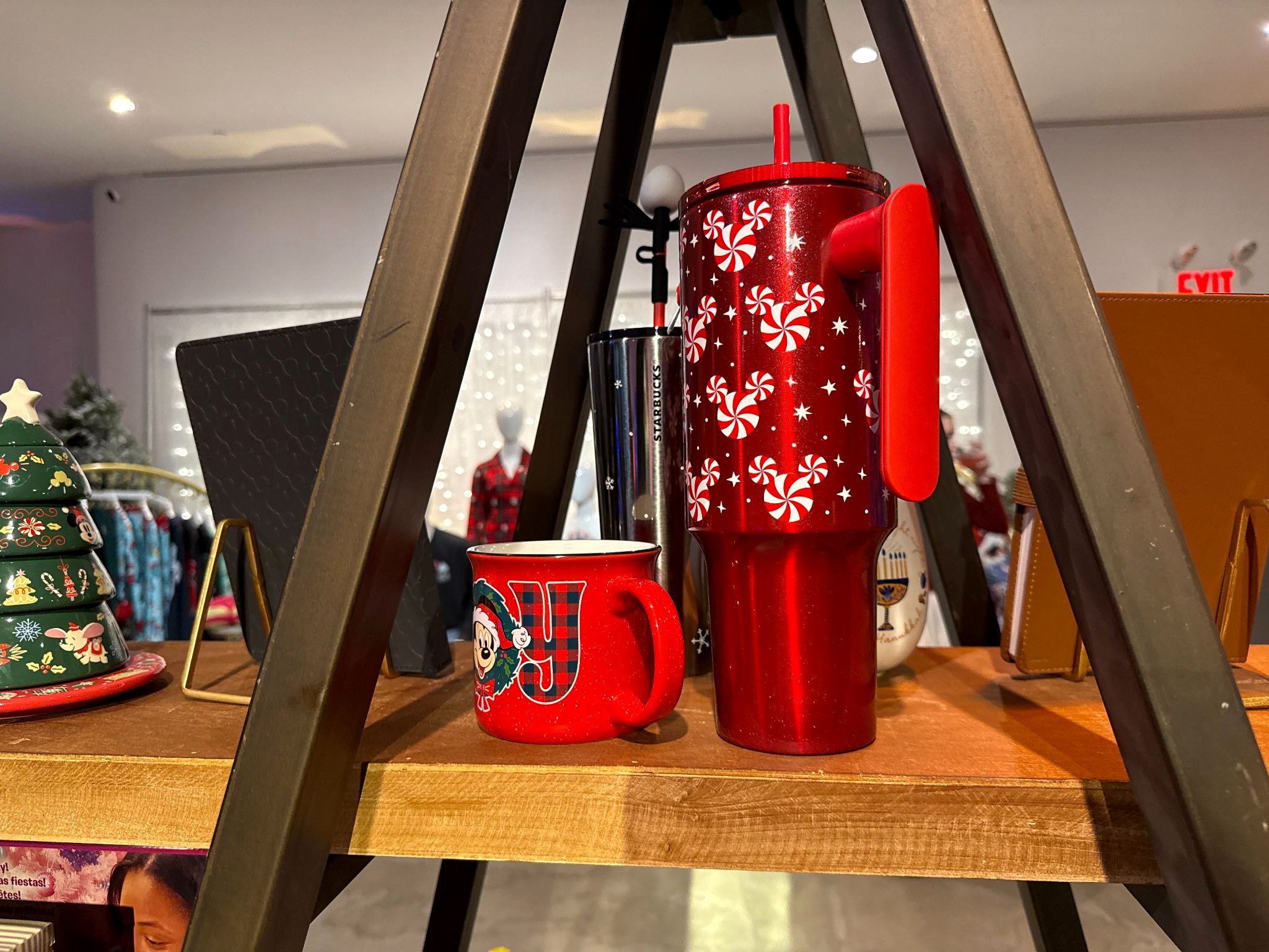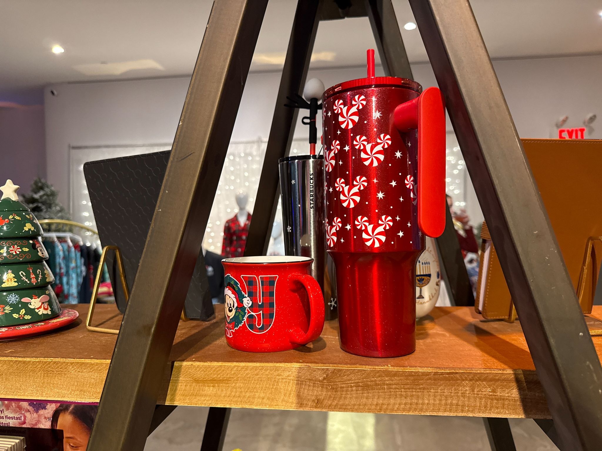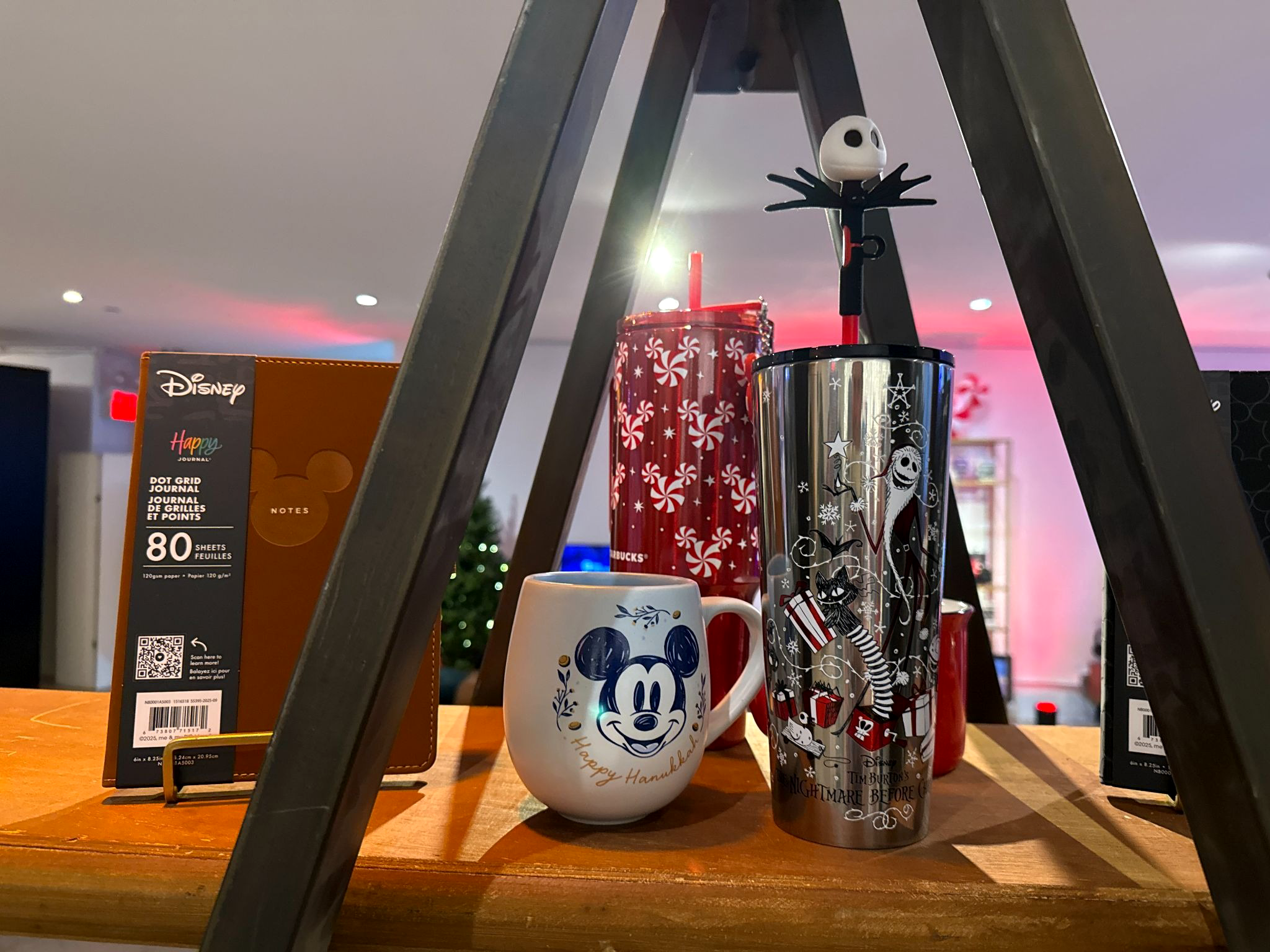 The next shelf celebrated winter warmth in every sense, from cozy beverages to seasonal sparkle. The Mickey Mouse Happy Hanukkah Mug ($19.99) adds a touch of Disney joy to the Festival of Lights, featuring Mickey alongside a menorah and spinning dreidels, with the message “love, light & eight nights.” Its soft satin glaze finish and simple charm make it equally at home on the breakfast table or in a holiday display. Right beside it, the Starbucks x Disney The Nightmare Before Christmas Tumbler ($49.99) puts a spooky twist on seasonal sipping. The double-walled design showcases Jack Skellington as Sandy Claws, surrounded by his mischievous toys, with a Jack straw topper wearing his signature bat bow tie. Equal parts eerie and elegant, it’s a must-have for fans who like their cocoa with a little Halloween spirit.