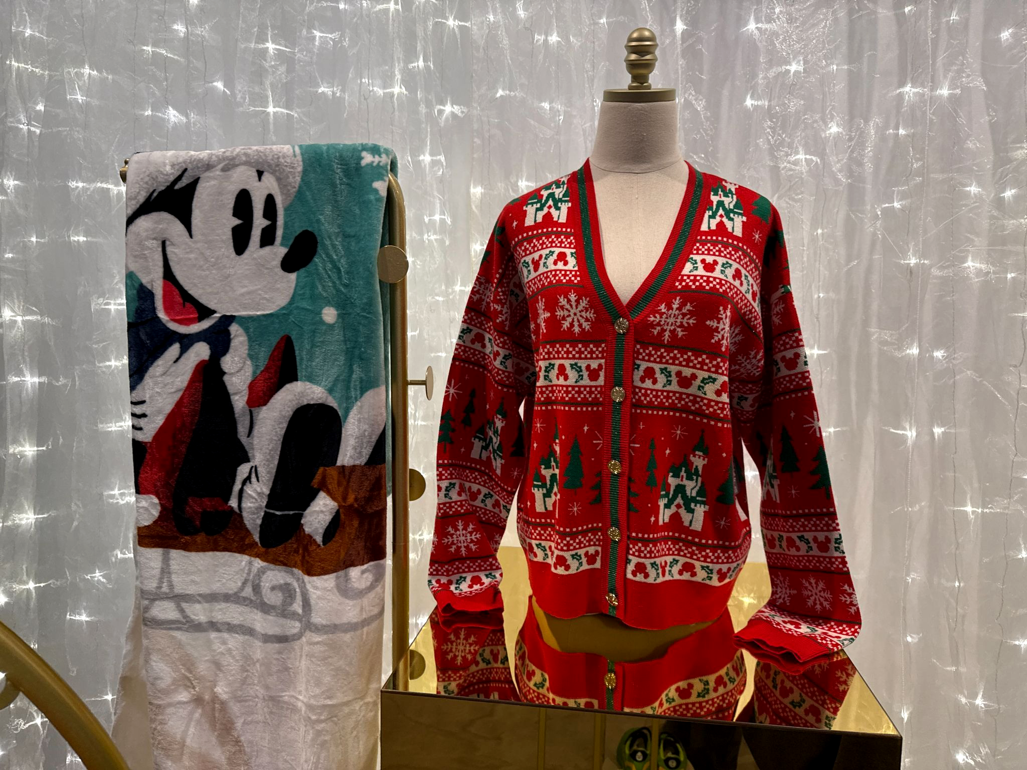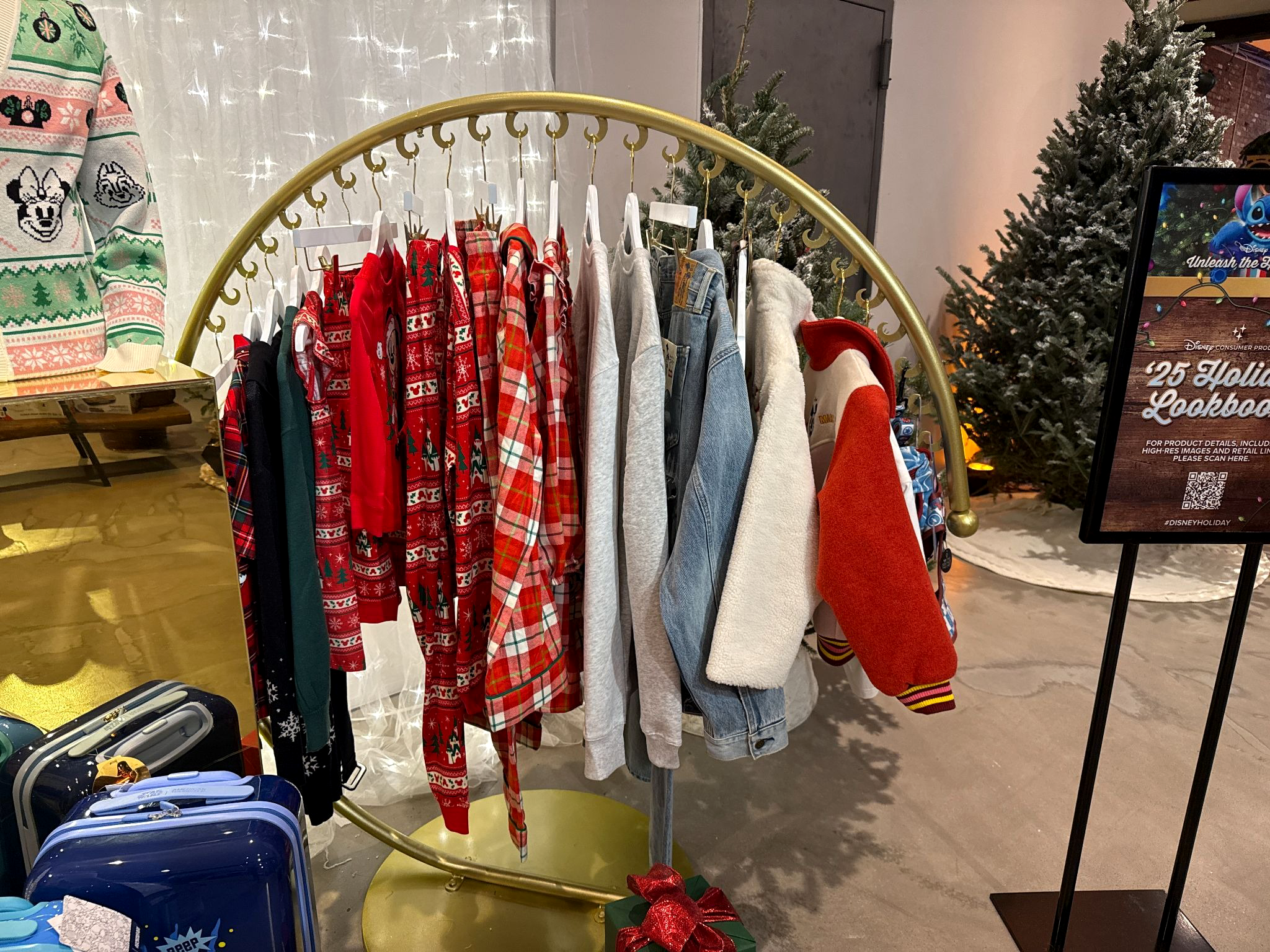 Moving down the display, another rack showed just how wide Disney’s holiday style spectrum can stretch — from cozy classics to high-fashion collaborations. The lineup began with the Her Universe Disney Mickey Mouse Snow Globe Sweater ($59.90), a forest-green pullover featuring Mickey bundled up in a sparkling snow globe scene that reads “Let It Snow.” Next came an assortment of sleepwear from Disney Store, including the Santa Mickey Mouse Holiday Nightshirt for Girls ($29.99) and the Mickey Mouse Holiday Sleep Set for Kids ($34.99), both trimmed in red and patterned with snowflakes, castles, and cheerful Mickey art. Adults could match the fun with the Mickey Mouse Icon Holiday Sleep Set for Women ($59.99) or opt for flannel style in the Santa Mickey and Minnie Plaid Sleep Sets ($59.99–$64.99).