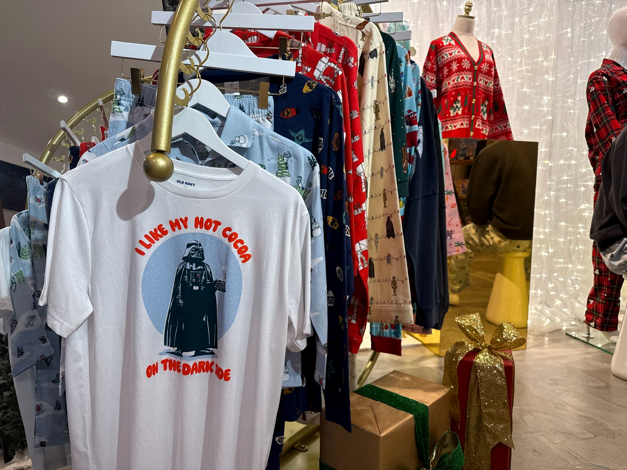 From cozy loungewear to fandom flair, this cozy rack showcased a galaxy of pajama options beyond the Old Navy lineup. The Hanna Andersson Star Wars Holiday Family Pajamas ($52–$130) bring festive fun to the dark side, featuring soft organic cotton and whimsical prints of Darth Vader, droids, and snowflakes — perfect for families who prefer their cocoa “on the dark side.” Right beside them, the Little Sleepies Disney & Pixar Christmas Village Collection ($16–$110) turns bedtime into a holiday celebration with characters from across Pixar’s worlds. Made from buttery-soft Lunaluxe Bamboo fabric, the mix-and-match pieces come in sizes for all ages, from infants to adults, so everyone can get cozy under the tree in Pixar style.