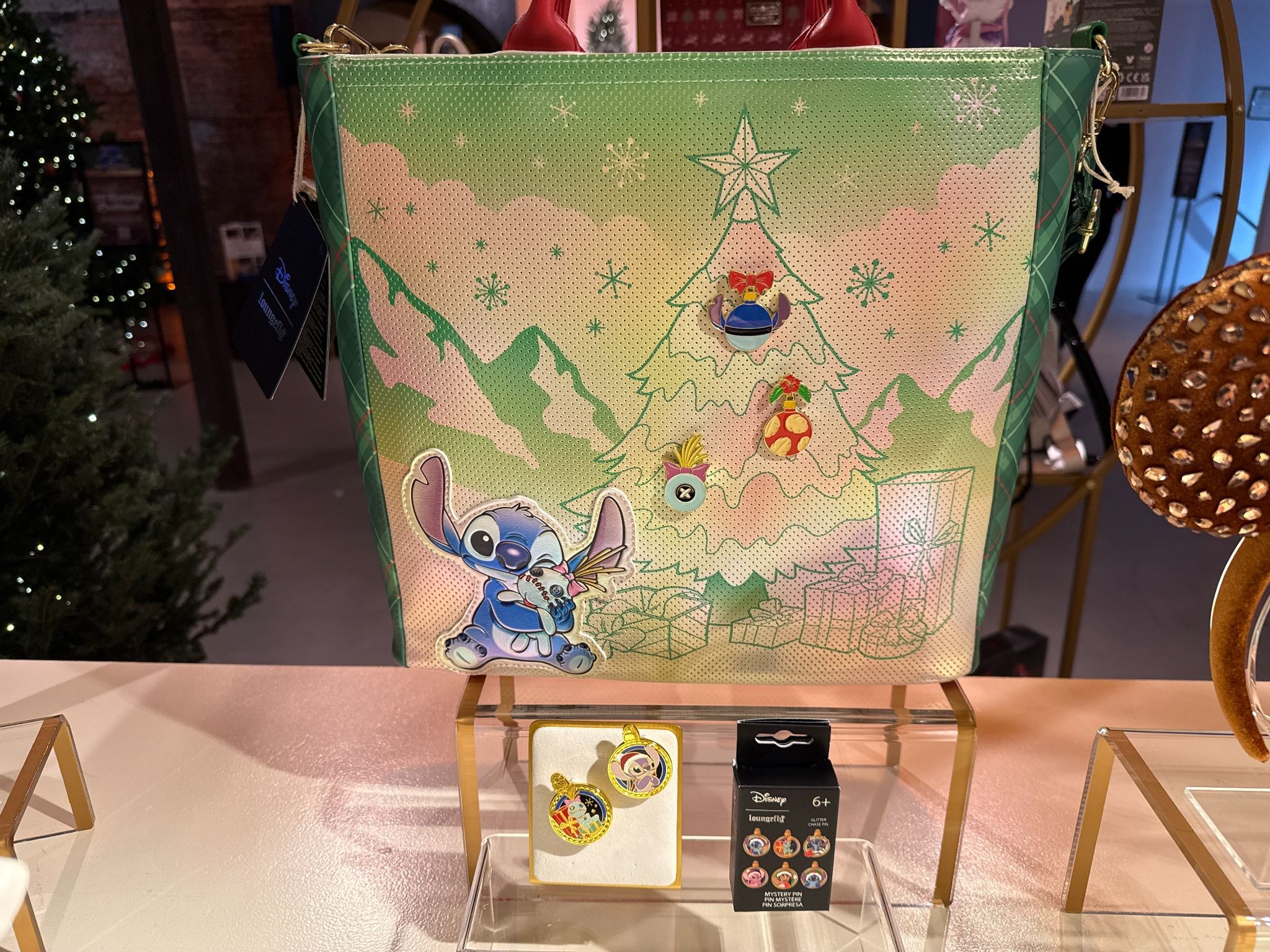 Fans of Lilo & Stitch will find plenty to celebrate with the Loungefly Lilo and Stitch Holiday Tote ($80.00), which transforms holiday cheer into a tropical-meets-festive statement piece. The perforated faux leather front doubles as a pin-trading surface, complete with ornament-shaped enamel pins that can be rearranged to “decorate” the tree, adding an interactive touch. Holiday plaid panels and pearlescent back detailing with ornaments and snowflakes complete the design, making this tote both playful and collectible — a perfect gift for Disney fashion fans who like their accessories merry and bright.