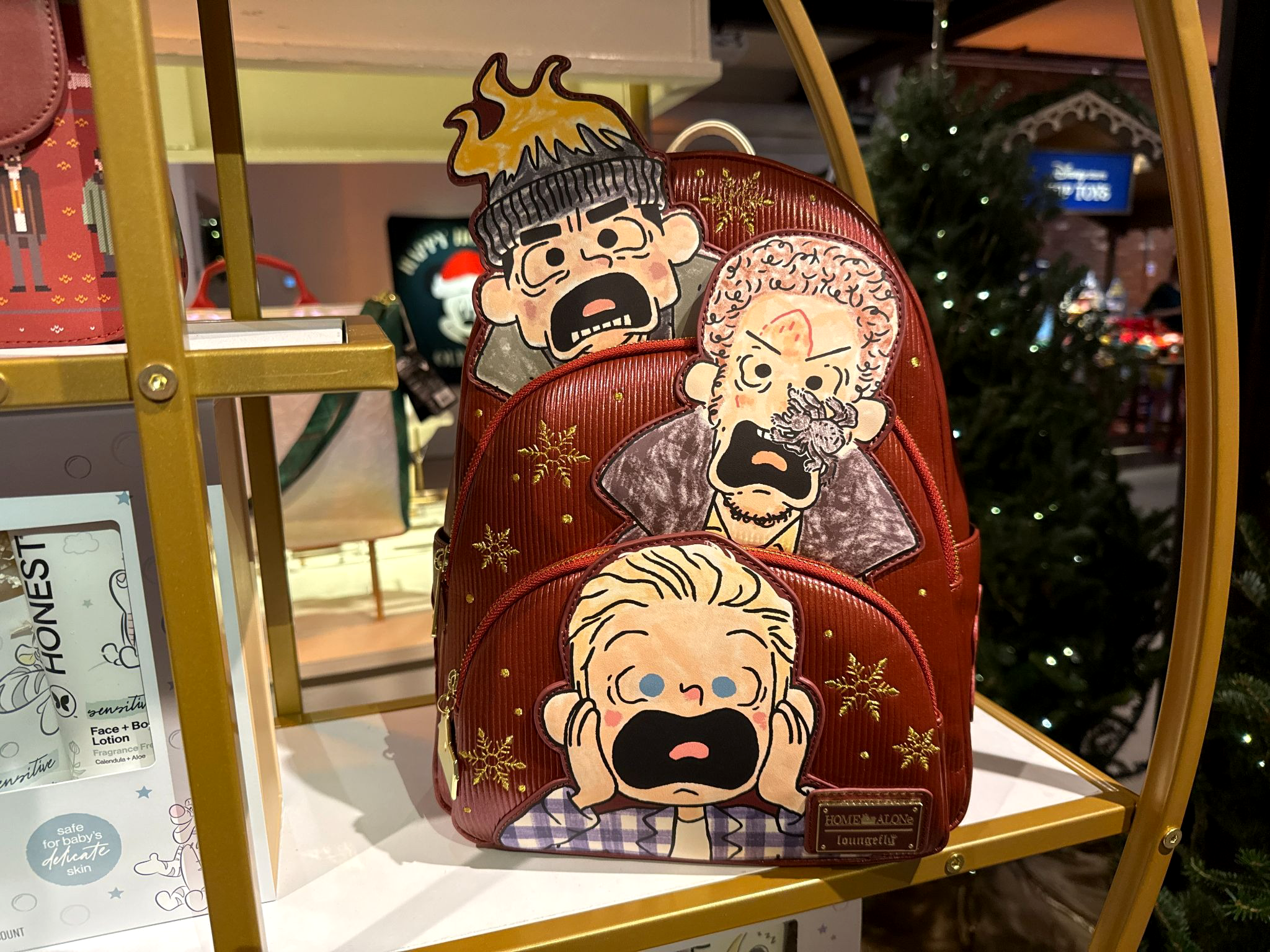 Bringing a cinematic twist to the season, the Loungefly Home Alone Triple Pocket Mini Backpack ($95.00) celebrates one of the most beloved holiday comedies of all time. Each of the three front pockets showcases a different character — Kevin, Harry, and Marv — framed by metallic embroidered snowflakes for a wintry touch. The rest of the bag is made from shiny red faux corduroy, giving it a cozy vintage feel, while a cheeky side pocket inscription reads “Merry Christmas, Ya Filthy Animals.” Equal parts nostalgic and stylish, this backpack is an instant statement piece for anyone who rewatches Home Alone every December.