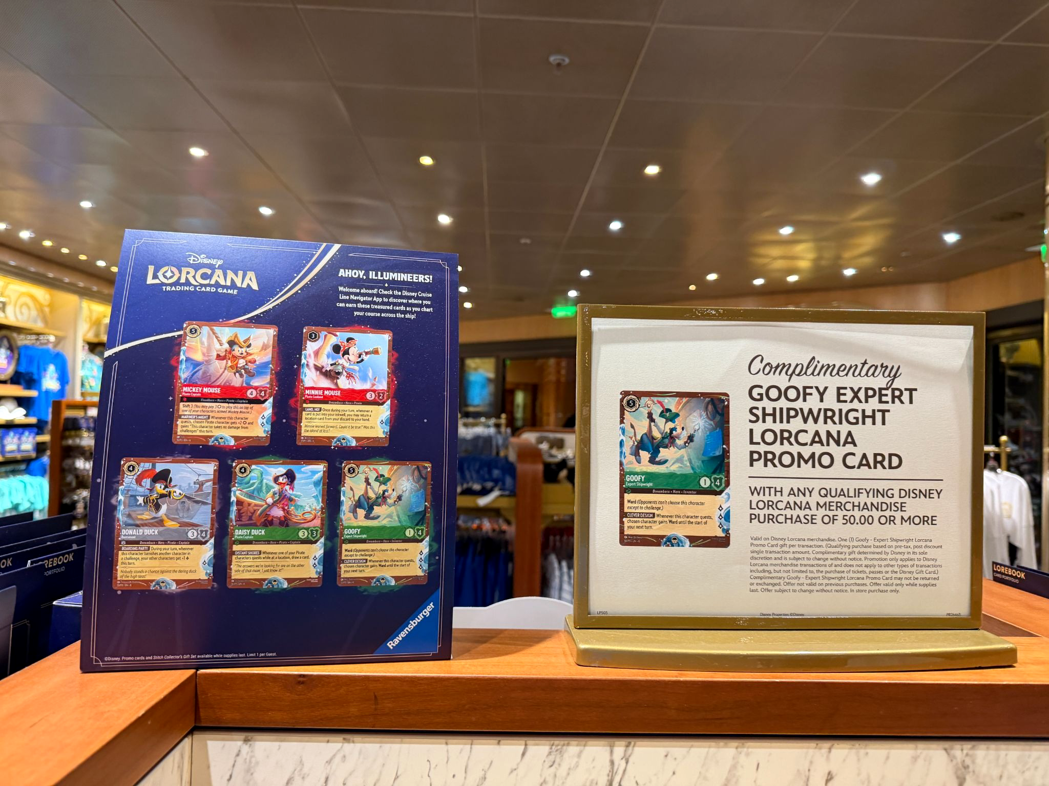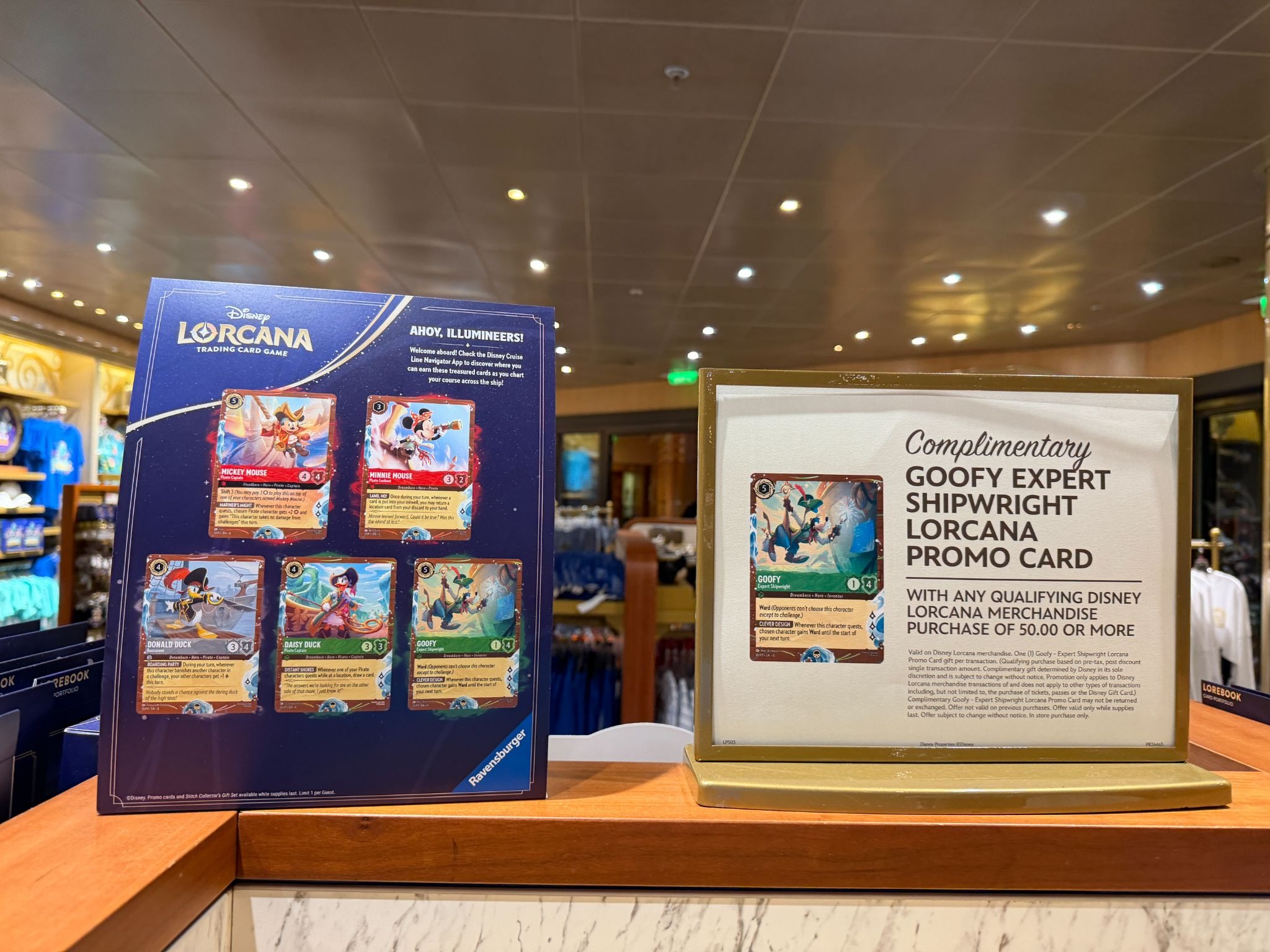 I first learned about the promotion while shopping on board. The Goofy Expert Shipwright foil card is a gift-with-purchase on Disney Lorcana merchandise totaling $50 or more. Mickey’s Mainsail only had Azurite Sea items in stock. The card advertising the exclusives said to check the Disney Cruise Line Navigator App for more information. However, the app doesn’t make it clear how to acquire the set.