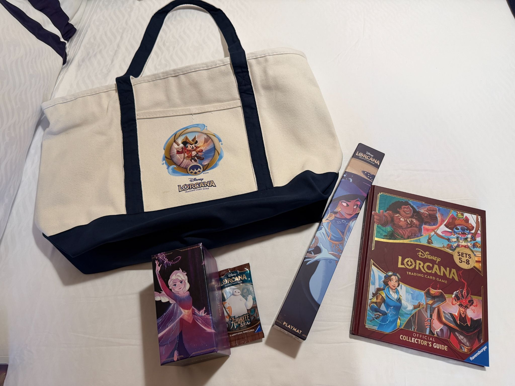 In the same section is the “Disney Lorcana TCG Collector Challenge,” a signature event that costs $99.99 per person (ages 8 and up). The price includes some Disney Lorcana merchandise – A copy of the Disney Lorcana Official Collector’s Guide Sets 5-8, a Disney Lorcana Playmat in a design that isn’t sold on the ship (Jasmine and Hades seemed to be the most common at my event), a Disney Lorcana Elsa Gift Set Box (which includes 5 Booster Packs), plus an additional Azurite Sea Booster Pack and an event-exclusive bag. This is how collectors can acquire the exclusive foil cards featuring Donald Duck Bucaneer and Daisy Duck Pirate Captain. (Note: Merely attending doesn’t mean you receive these cards. Keep reading!)