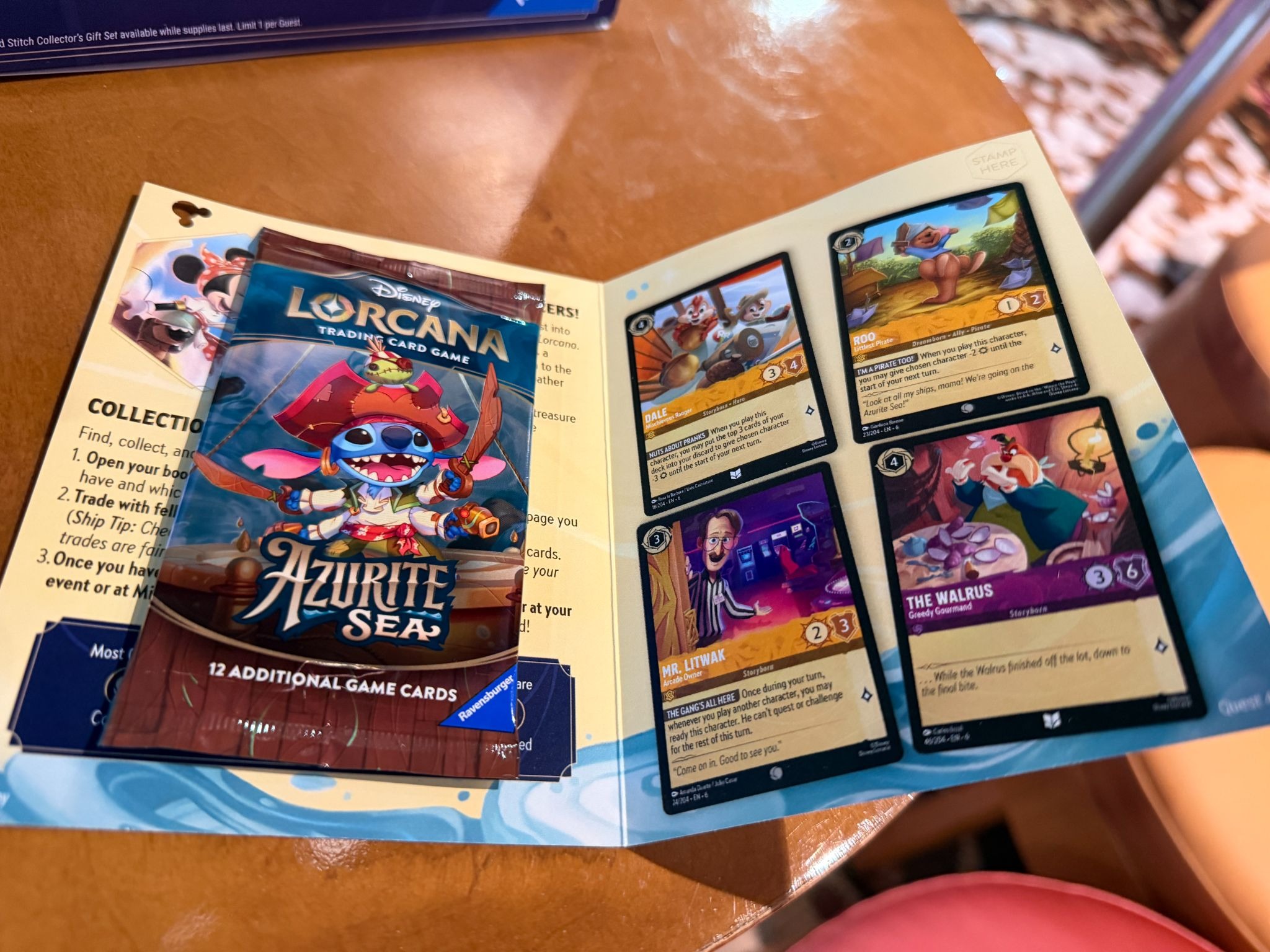 At both the free Collector Quest and the paid Collector Challenge events, Guests receive at least one free Azurite Sea Booster Pack, which comes in a Disney Lorcana Quest at Sea pamphlet. Inside, Guests are shown 4 cards that they must collect in order to redeem for one of the two cards exclusive to that event.