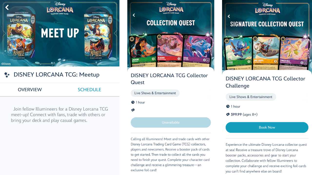 Within the “Explore” section of the Nagigator app, Guests will find several Disney Lorcana TCG Meetup events. These are unhosted meeting times where you can find other players and collectors on board. There are no promotional items at these events.