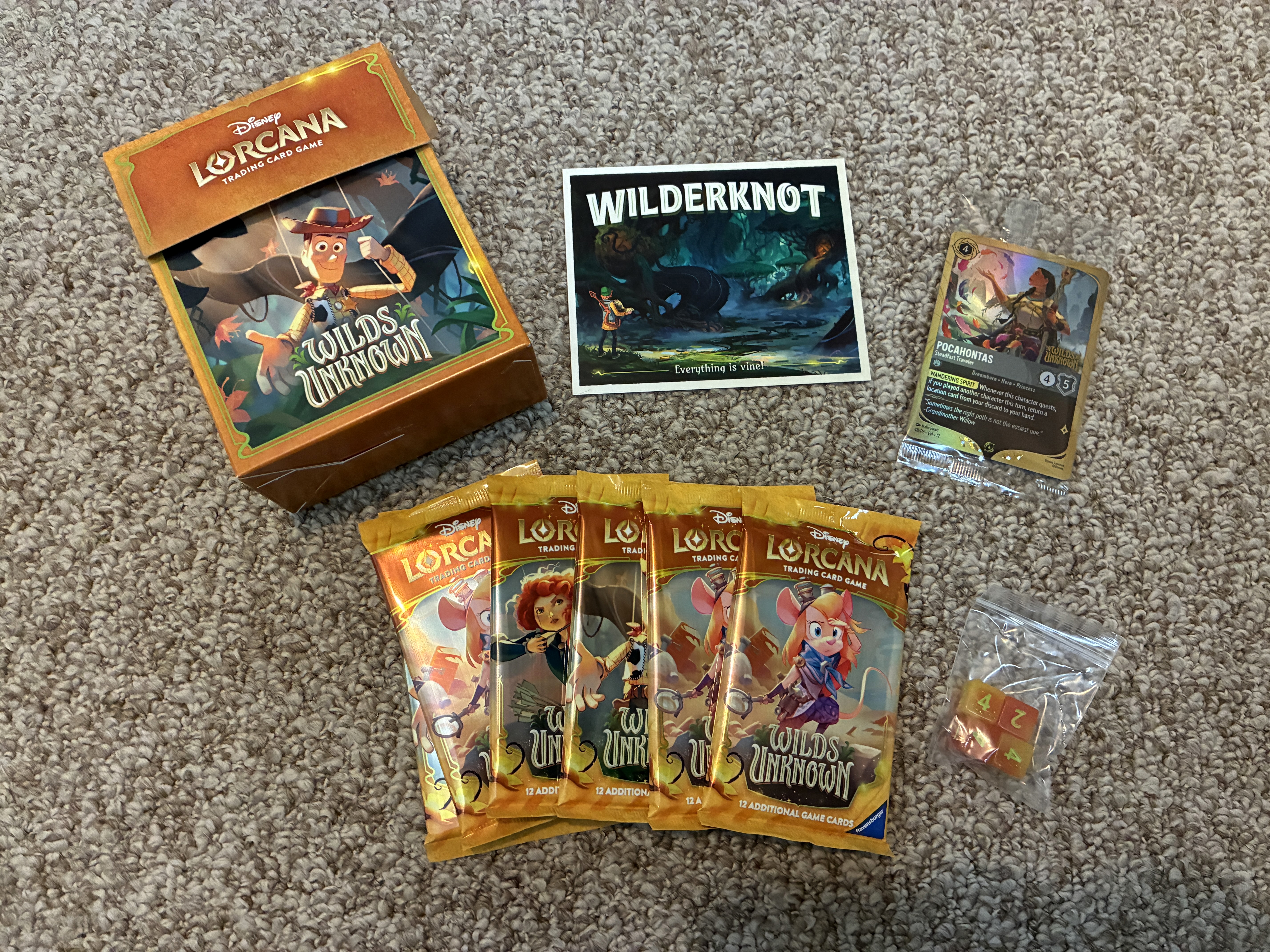 Opening my Prerelease Box, I was excited to see that I got the Wilderknot postcard and a Pocahontas - Steadfast Traveler promo card. These promo cards are foils and are stamped with the Wilds Unknown logo. As mentioned, there are six different randomly-issued cards as part of these boxes — one of each ink color.