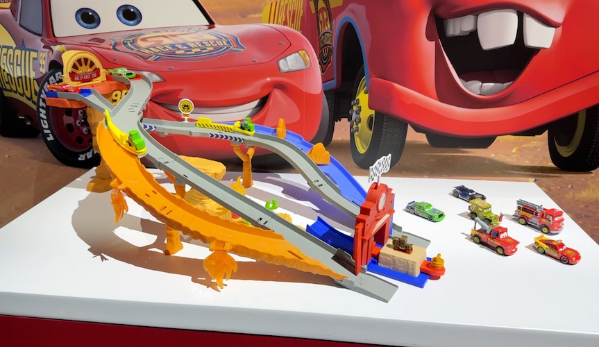 Launching this fall, the Radiator Springs Race & Rescue Road Raceway Playset ($39.99, 4+, Fall 2025) features two modes: competitive racing between Lightning McQueen and Chick Hicks, or rescue play where McQueen clears the track. The set includes two pitty crew figures, expanding the storytelling opportunities around the Radiator Springs Rally Race 200.
