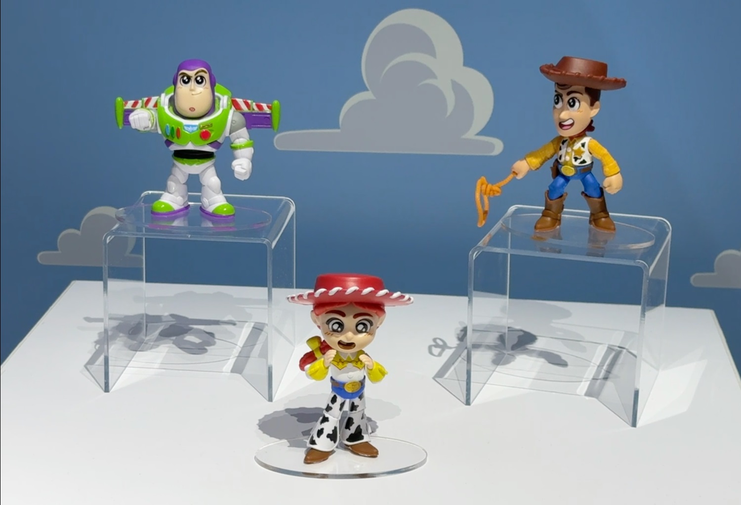 Also debuting are Click Figs, stylized 3.5-inch action figures with repeatable motion and signature poses. Fall 2025 releases include Jessie and Woody ($9.99 each, 4+), each with a head-activated action that shifts the figures between iconic stances. Buzz Lightyear ($9.99, 4+, Available Now) features a flight-ready pose with raised fist and deployed wings, triggered by pressing his head, accompanied by a satisfying click.
