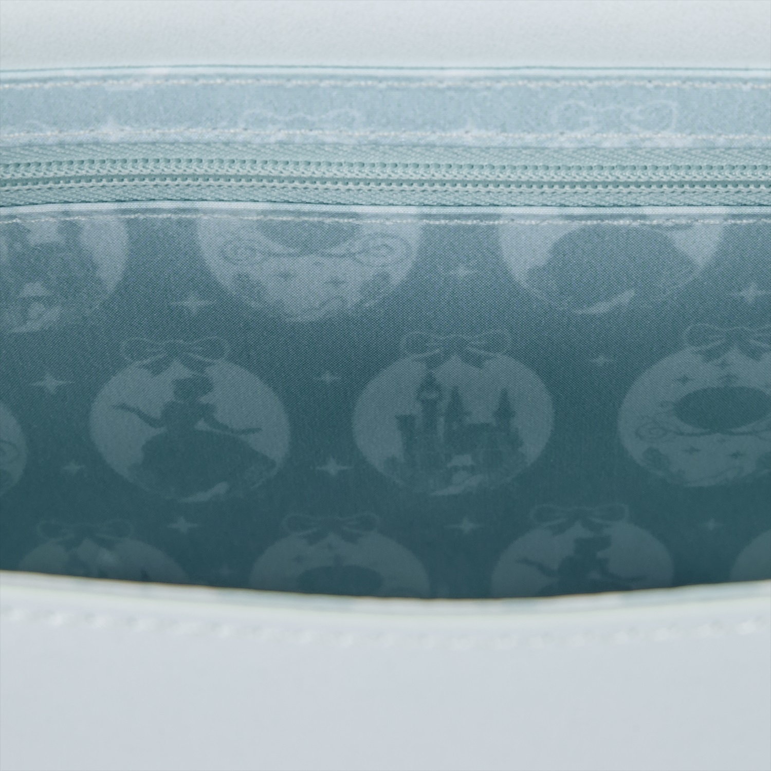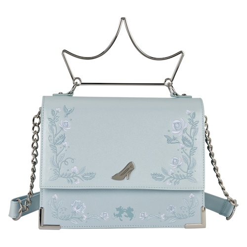 - This bag features shimmery faux leather with embroidered floral details. In the center of the front flap, you'll find a molded metal charm of Cinderella's glass slipper. Attached to the top is a molded metal top handle in the shape of a tiara, adding a regal feel to any outfit.