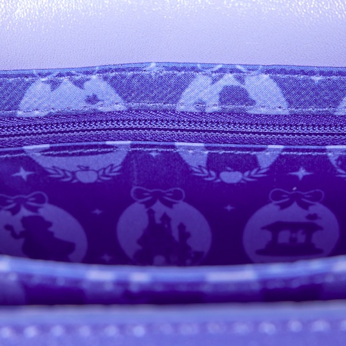 - This crossbody bag pays homage to Snow White, and you'll find a molded top handle in the shape of an apple. There's also a molded metal charm of an apple on the front flap of the bag. Embroidered floral details give an elegant feel against shimmery faux leather.