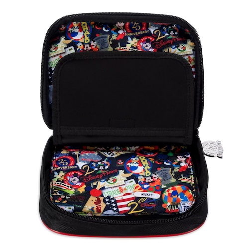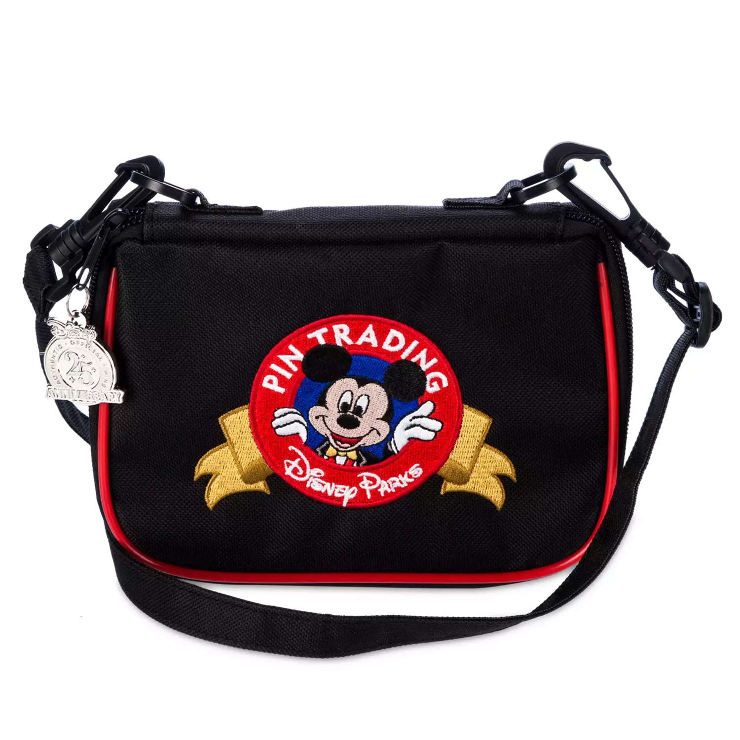 - Embroidered with the Pin Trading Disney Parks logo, the crossbody bag comes adorned with a 25th Anniversary zipper pull and an all-over print inside celebrating Disney Parks history.