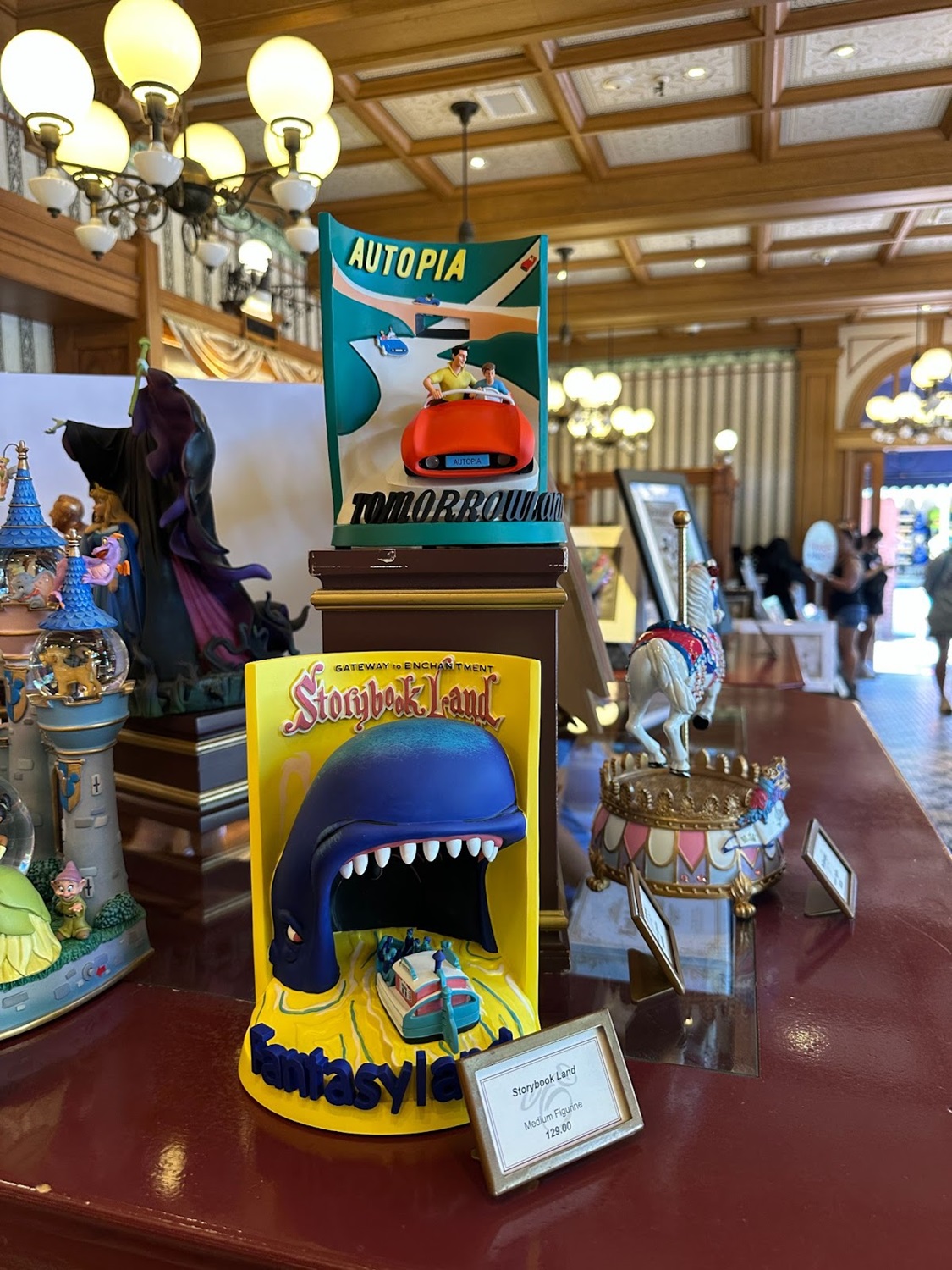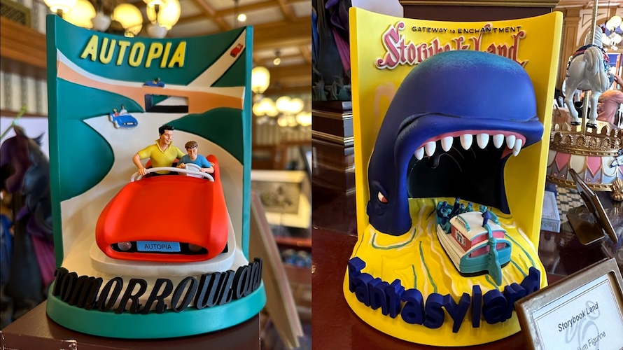 Available at the Disneyana Shop on Main Street, U.S.A., these two 3D attraction poster figurines bring two classic designs into three dimensions. First up is the Autopia attraction poster, recreated with a three-dimensional Autopia car with the Tomorrowland written in front of it.