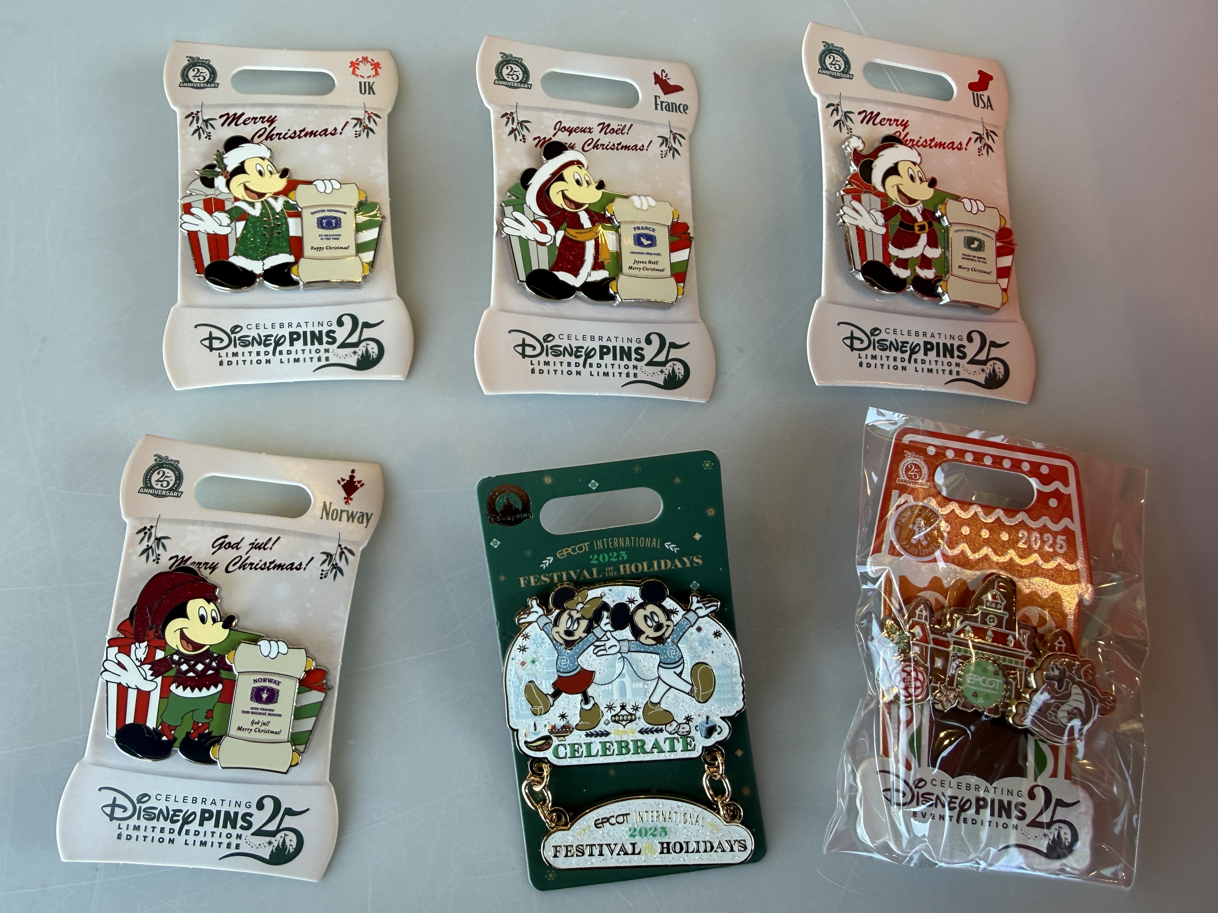 Finally, we have the usual assortment of pins, mostly featuring Mickey Mouse, but there is also one featuring The American Adventure's Gingerbread House, and one featuring Mickey and Minnie wearing Figment's sweater. The pins range in price from $19.99 to $22.99.