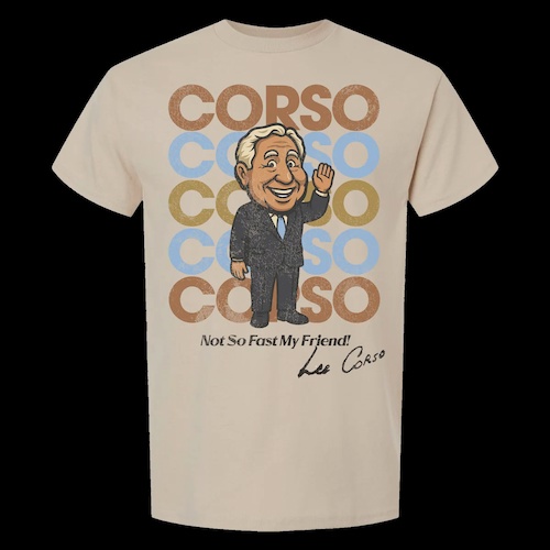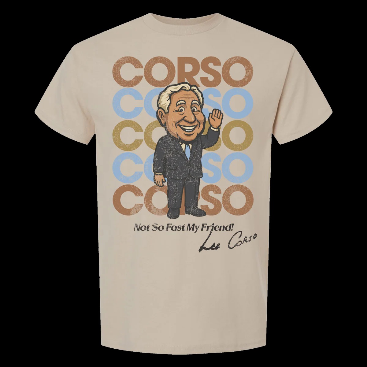 College GameDay Corso Character Tee ($40): This t-shirt features a caricature of Corso in a suit, waving, with his famous catchphrase, "Not So Fast My Friend!" and his signature underneath.