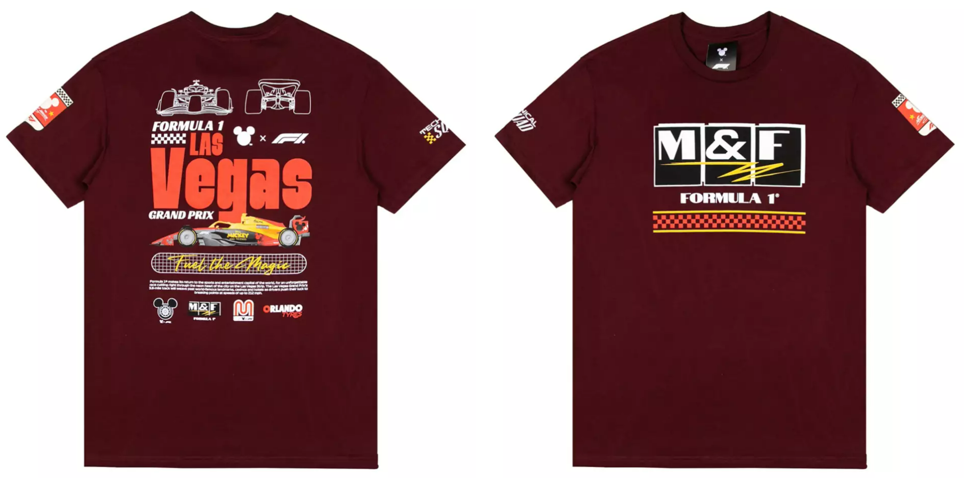 - Disney x Formula 1 T-Shirt for Adults ($55): The shirt sports the custom “M&F Formula 1” logo on the front, with a “Las Vegas” call-out and an image of an F1 car on the back.