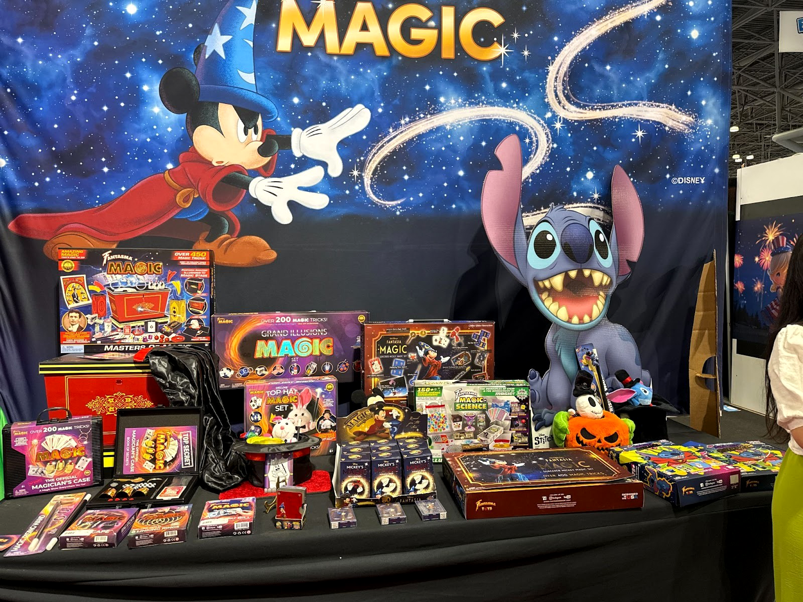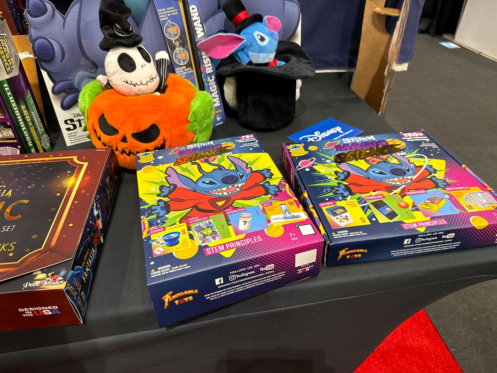 Disney projects in development, including a classic rabbit-in-a-hat trick with Mickey Mouse, Stitch, and Jack Skellington prototypes on display, plus a Stitch-themed magic wand and potential Stitch overlays for the company’s STEM Magic Science educational line.