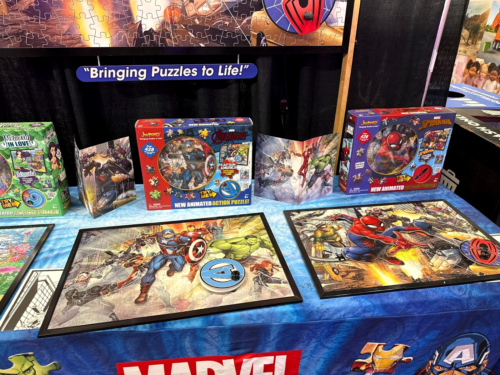 On the Marvel side, Fantasma showcased its JigPetto animated puzzles, including Marvel Spider-Man JigPetto and Marvel Avengers JigPetto (both $34.99). Each set combines a 428-piece jigsaw puzzle with a crank-powered animation mechanism that brings the finished 2D character to life inside a decorated frame. The kits include all necessary components, online video instructions, and conform to strict toy safety standards for ages 8 and up.