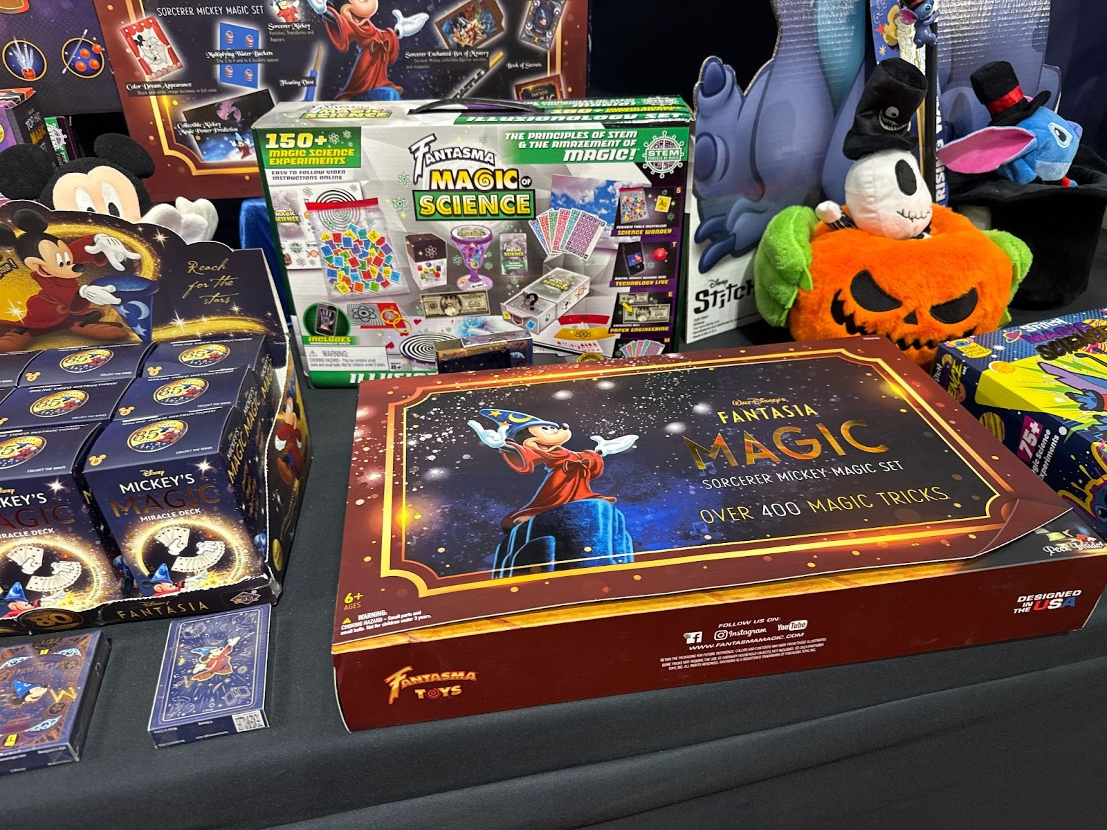 Disney projects in development, including a classic rabbit-in-a-hat trick with Mickey Mouse, Stitch, and Jack Skellington prototypes on display, plus a Stitch-themed magic wand and potential Stitch overlays for the company’s STEM Magic Science educational line.