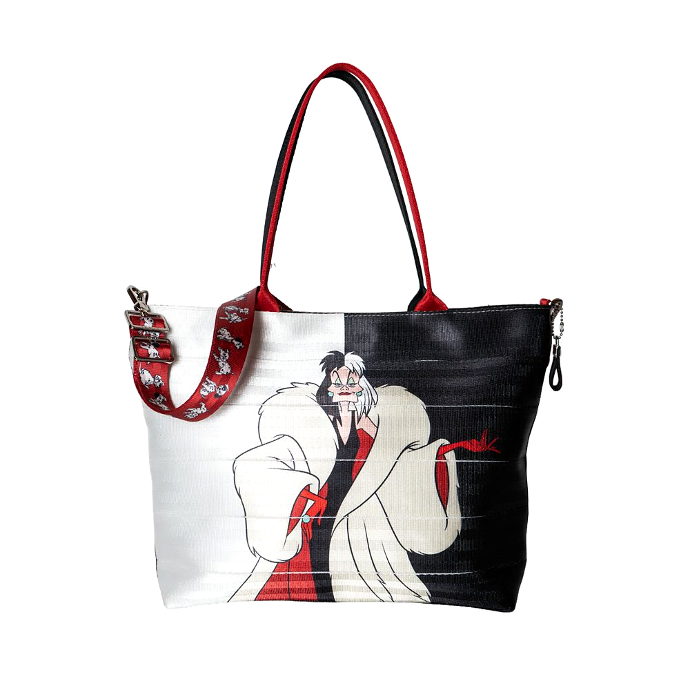 - True to Cruella’s black and white hair preference, the front of the bag features both colors, each taking up one side. A screen print of the villain is placed in the center, presented her in one of her calmer moments.