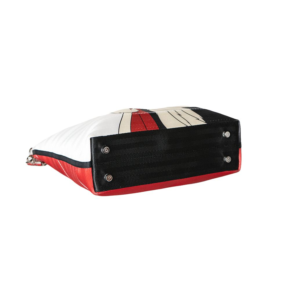- True to Cruella’s black and white hair preference, the front of the bag features both colors, each taking up one side. A screen print of the villain is placed in the center, presented her in one of her calmer moments.