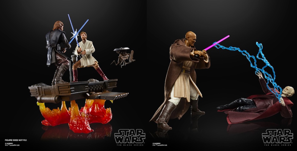Convention exclusives are also a major draw. The SDCC-exclusive Black Series Anakin Skywalker & Obi-Wan Kenobi ($109.99) recreates their iconic duel on Mustafar with effects pieces and a display base. Fall conventions will feature the Black Series Mace Windu & Darth Sidious 2-pack ($59.99).