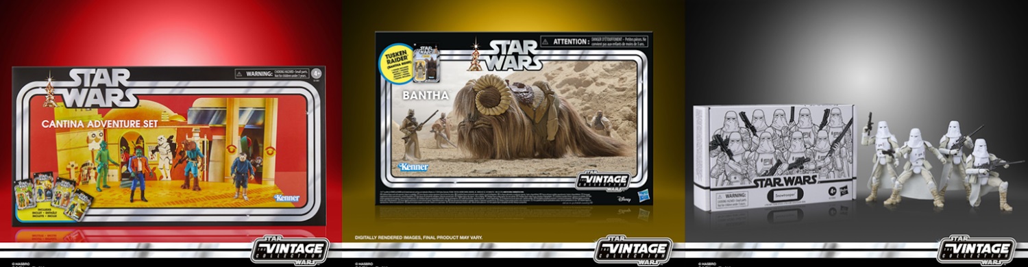 For 3.75-inch collectors, The Vintage Collection is getting a huge boost with the Jedi Spirits 3-Pack ($49.99), new troop-builder packs like the Snowtroopers ($54.99) and the Cantina Adventure 4-Pack ($64.99), a massive Bantha with Tusken Raider ($69.99), and essential vehicles like Darth Vader's TIE Advanced ($139.99).