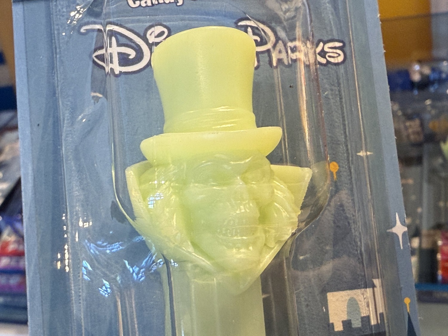 Yesterday, we spotted a new Figment PEZ dispenser available at the Image Works store at the exit to Journey into Imagination with Figment in EPCOT. Today, while at Disney Springs, our intrepid reporter spotted yet another new PEZ dispenser – this time featuring the infamous Hatbox Ghost from The Haunted Mansion. Retailing for $4.49, the glow-in-the-dark Hatbox Ghost PEZ dispenser comes with three flavors of PEZ: grape, raspberry and cherry.
