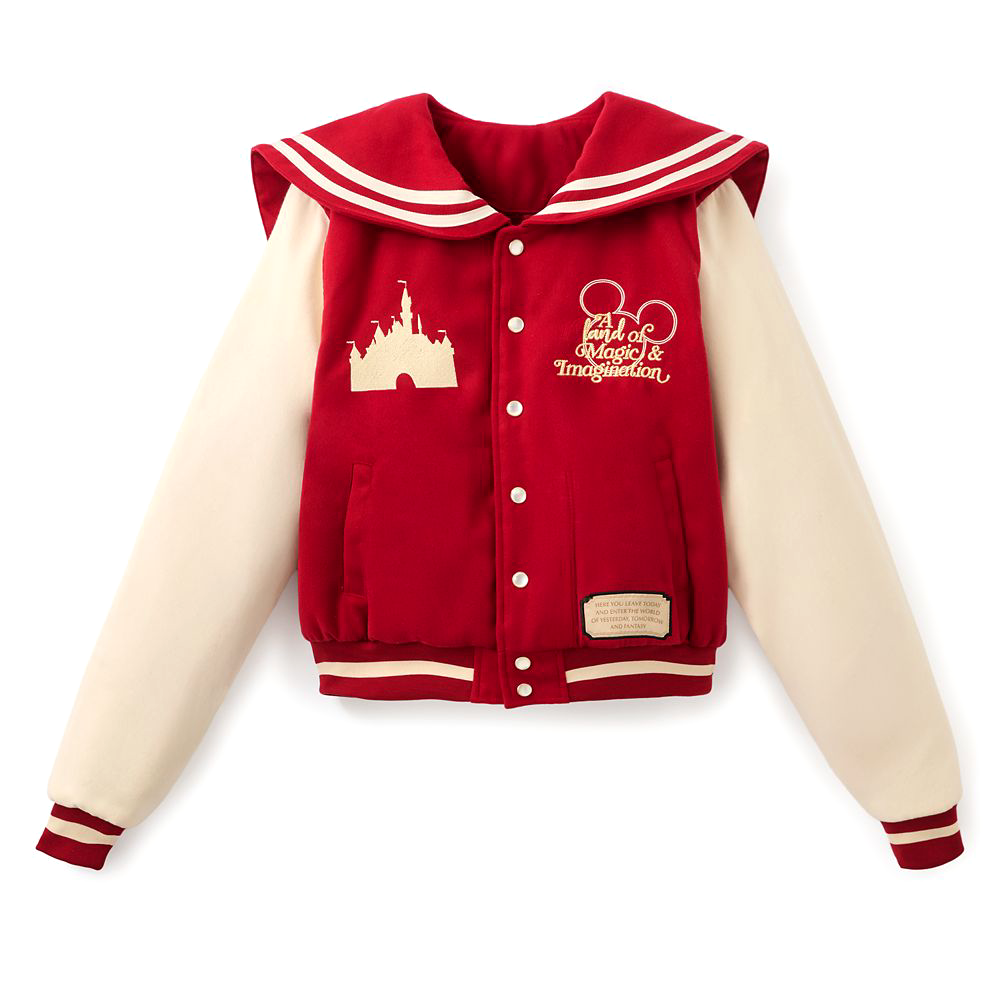 - The woman's crop jacket features snap closures, a striped hem, and soft cuffs, plus boasts impressive embroidery of the Fantasyland Castle, a Mickey Mouse head, and the quotes, "Disneyland Resort" on the back of the flared collar, and "A Land of Magic and Imagination" on the front.