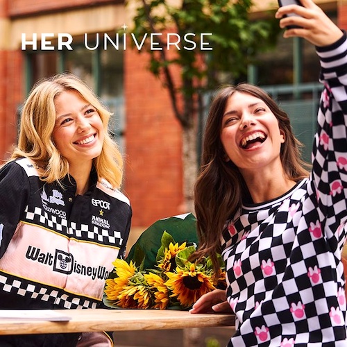 - Her Universe has gathered essential Disney logos like the Walt Disney Parks icons and Minnie Mouse’s head and found ways to weave them among the signature checkered flag seen on the race course.