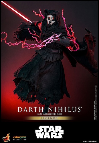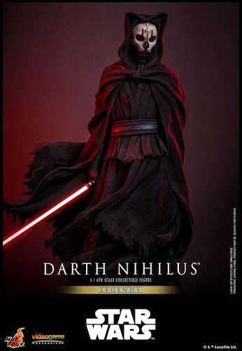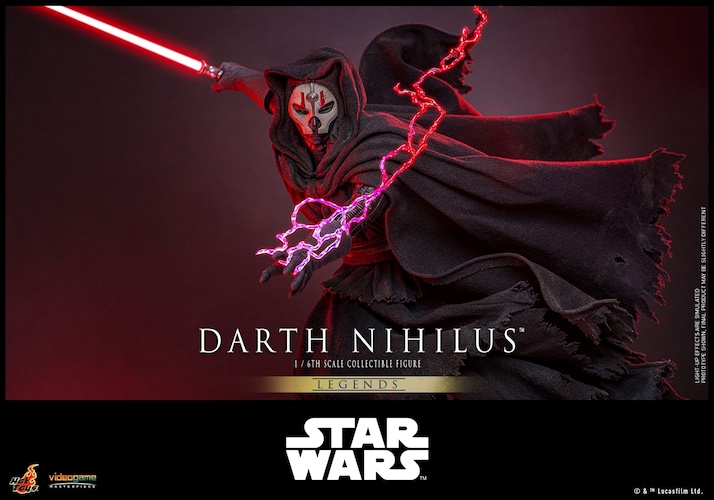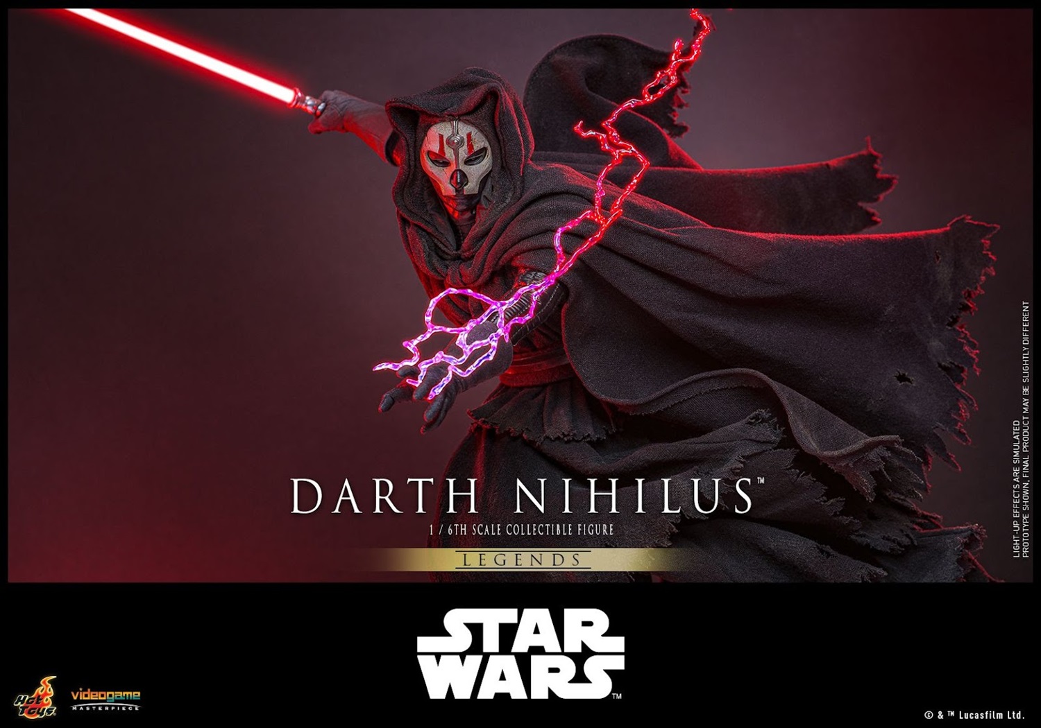 - “The meticulously crafted Darth Nihilus 1/6 Scale Collectible Figure by Hot Toys features a newly developed masked headsculpt. The specialized body boasts over 30 points of articulation, allowing for a variety of dramatic poses. Darth Nihilus is dressed in a detailed outfit, which includes a black cape with hood and embedded wire, layered tunics with embedded wire, a belt, and pants."