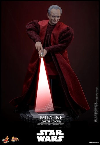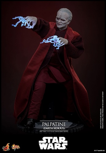 - The Palpatine/Sidious figure features a layered fabric outfit with embedded wire, alternate hands with blue lightning effects, and an LED light-up lightsaber with a regular blade, plus a blade-in-motion effect. It sells for $285 and can be pre-ordered right now via Sideshow Collectibles.