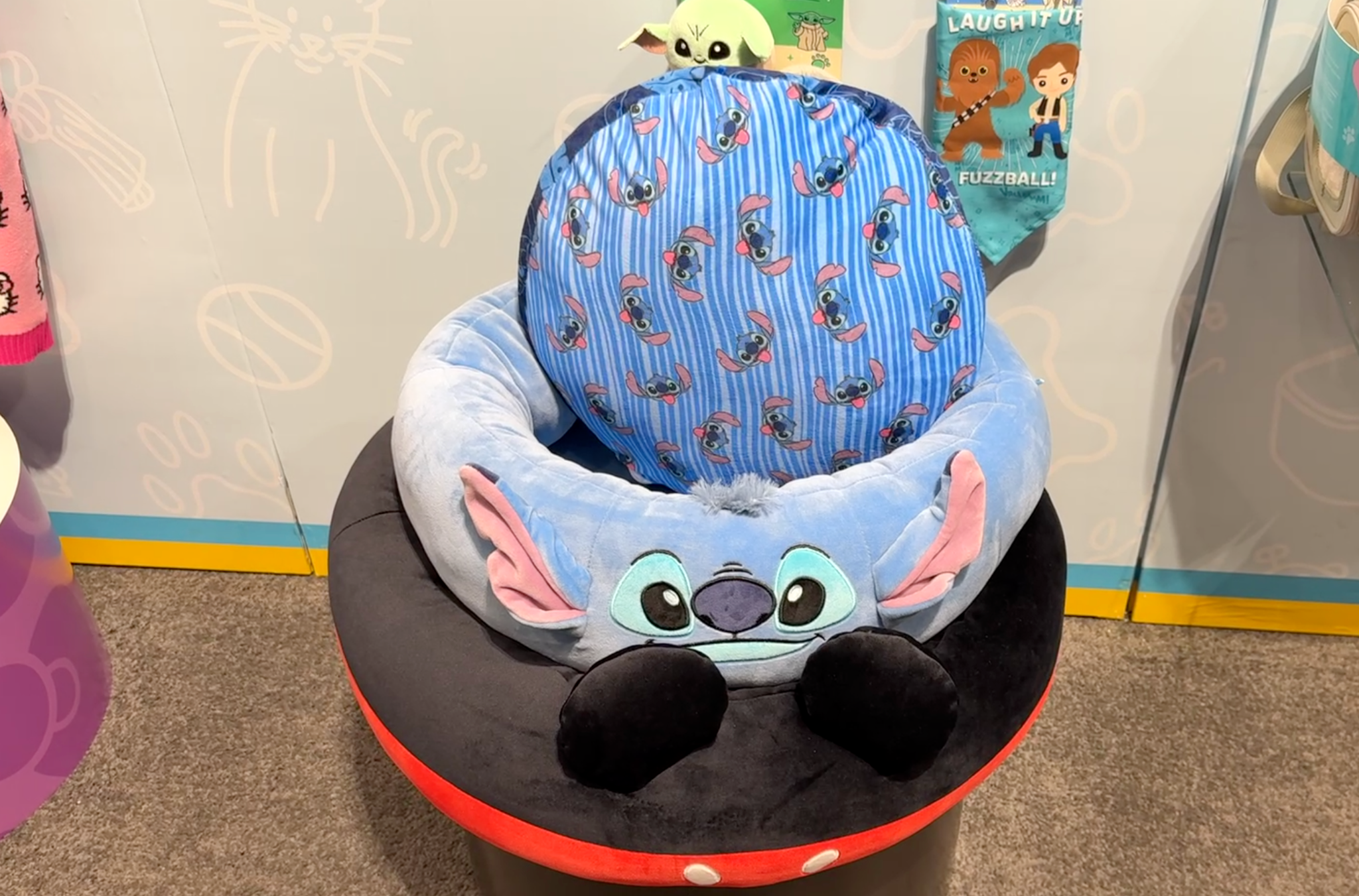 Pet offerings continue to grow with the Jazwares Character Stitch Dog Bed (available in small, medium, and large for $34.99–$54.99), a plush bolster-style bed featuring ultra-soft materials and an embroidered Stitch design. The bed includes an edge-supported frame and a removable, double-sided flatbed insert with two patterns for easy cleaning, making it a practical and cozy option for pet parents who love Disney’s mischievous alien. A Mickey Mouse–themed pet design was also on display, teasing additional character options within Jazwares’ expanding Disney pet lineup.