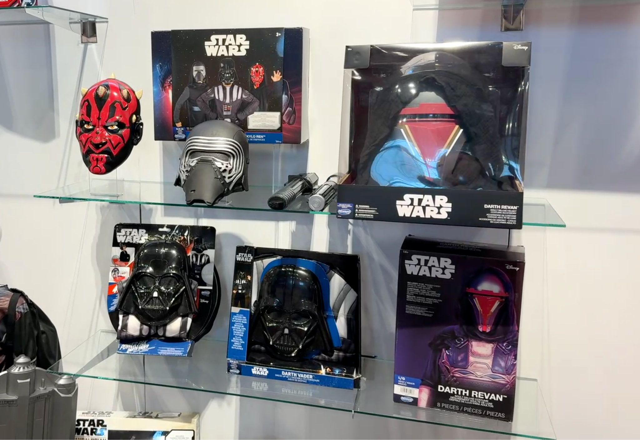 Dark Side energy was strong in Jazwares’ Star Wars Costume Play display, led by the STAR WARS Villains Official Youth Dress-Up Set ($59.99), which bundles three distinct looks inspired by Darth Vader, Darth Maul, and Kylo Ren into one multi-piece set for younger fans. For adult collectors and cosplayers, the spotlight shifted to Revan with the Jedi Knight Revan Deluxe Helmet for Adults ($79.99), featuring a weathered finish and attached fabric hood, alongside the full Star Wars Darth Revan Official Adult Halloween Costume ($89.99), a six-piece set inspired by Knights of the Old Republic that includes a long tunic, padded armor, gauntlets, and gloves. Together, the assortment highlights Jazwares’ push beyond kids’ dress-up into more premium, collector-focused Star Wars roleplay offerings.