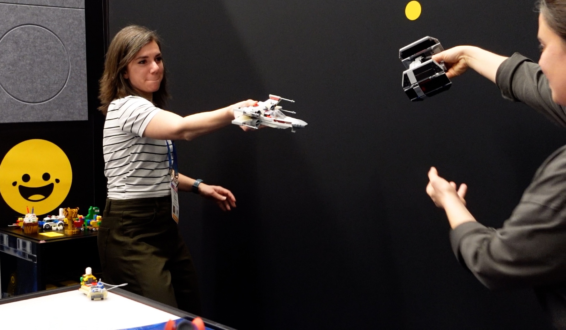 Before we got to the Star Wars section of our demo, a team member from LEGO, who helped develop SMART Play showed us some other possible scenarios. After some basic demos of the tags and brick (such as a helicopter that makes different noises as kids "fly" it), they walked us through some storytelling possibilities. For example, they set up a scenario with a police car, policeman, and a robber. When the robber approached the car, an alarm would sound. Once he ran away and the cop returned, the alarm would stop. Then, when the officer took a nap in the backseat, you could hear him snoring... only for the robber to awake him by trying again to steal the vehicle.