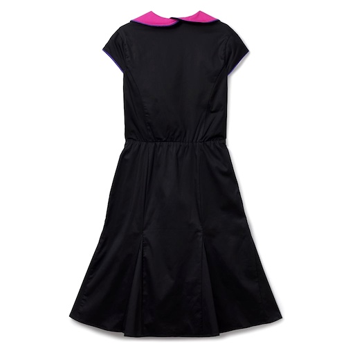 - This solid black dress features a natural waist with a flair skirt that opens to reveal bright patches of pink fabric. Along the front hemlines are purple piping for a dramatic effect, while purple thorn and horns embroidery embellish the collar.