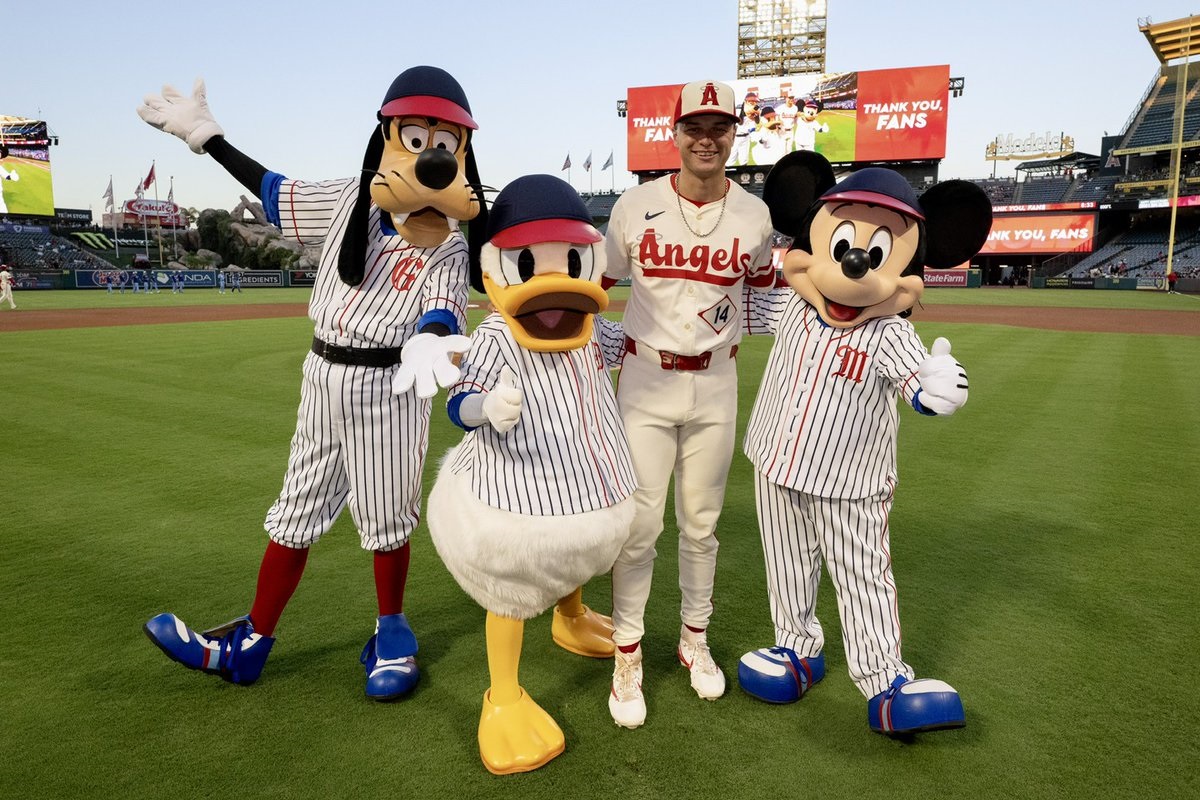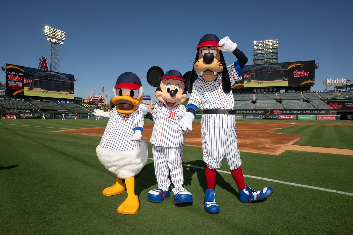 - Mickey Mouse, Donald Duck, and Goofy appeared at Angel Stadium in Anaheim in celebration of the new collaboration between Topps, Disney, and MLB.