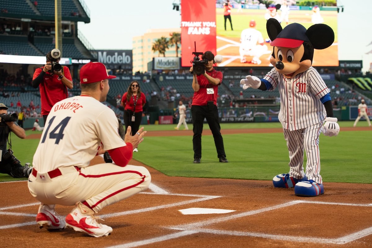 - In photos from the appearance, the three beloved Disney characters posed with players from the Los Angeles Angels, and it looks like Mickey Mouse even got the chance to throw a pitch… from very close to home plate.