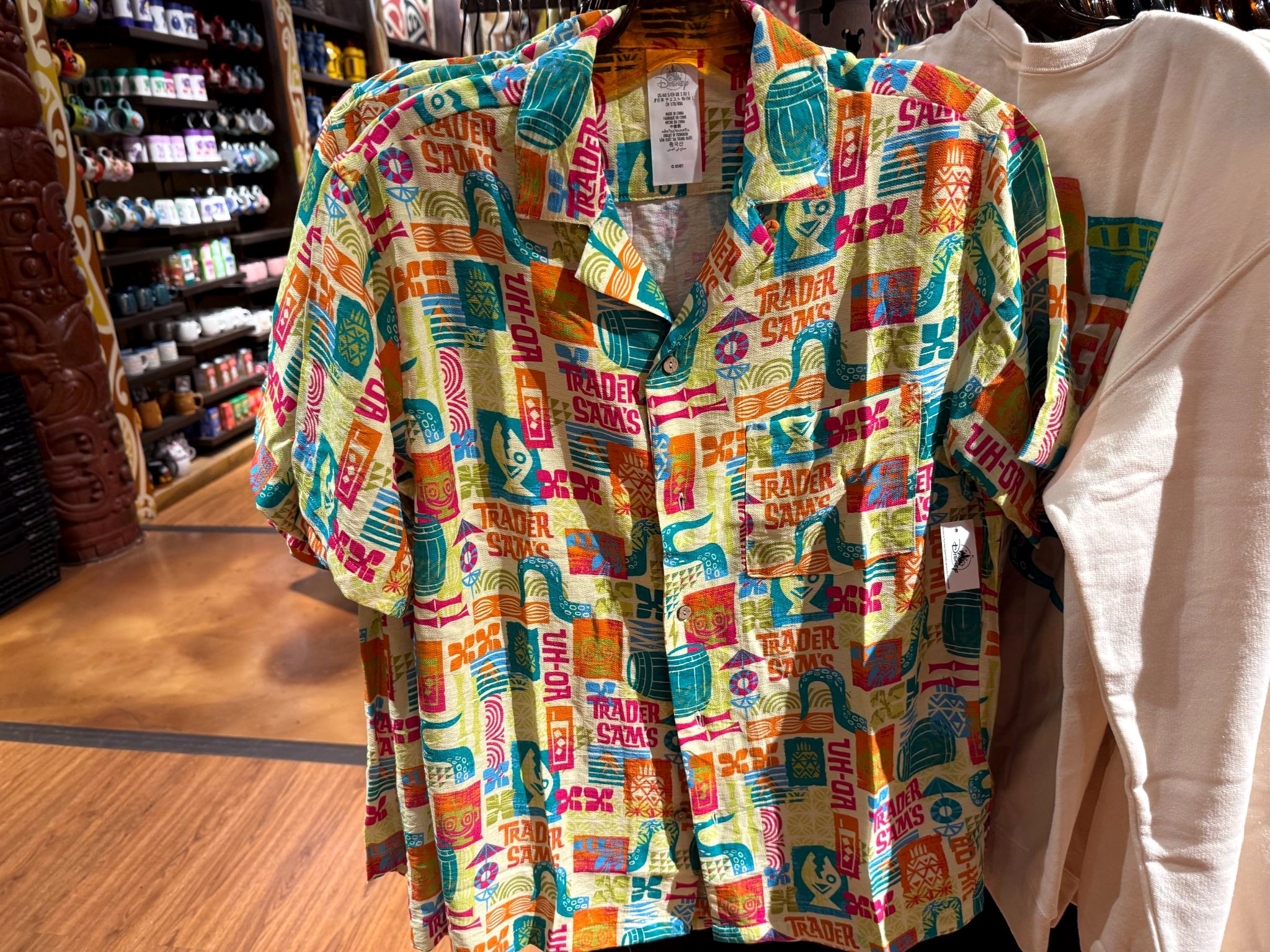 We first spotted some of this collection at Disneyland back in July, but it has also migrated over to Walt Disney World. The one item that remains the same is this delightful button-up shirt ($69.99) featuring a number of tiki mugs alongside the logo.