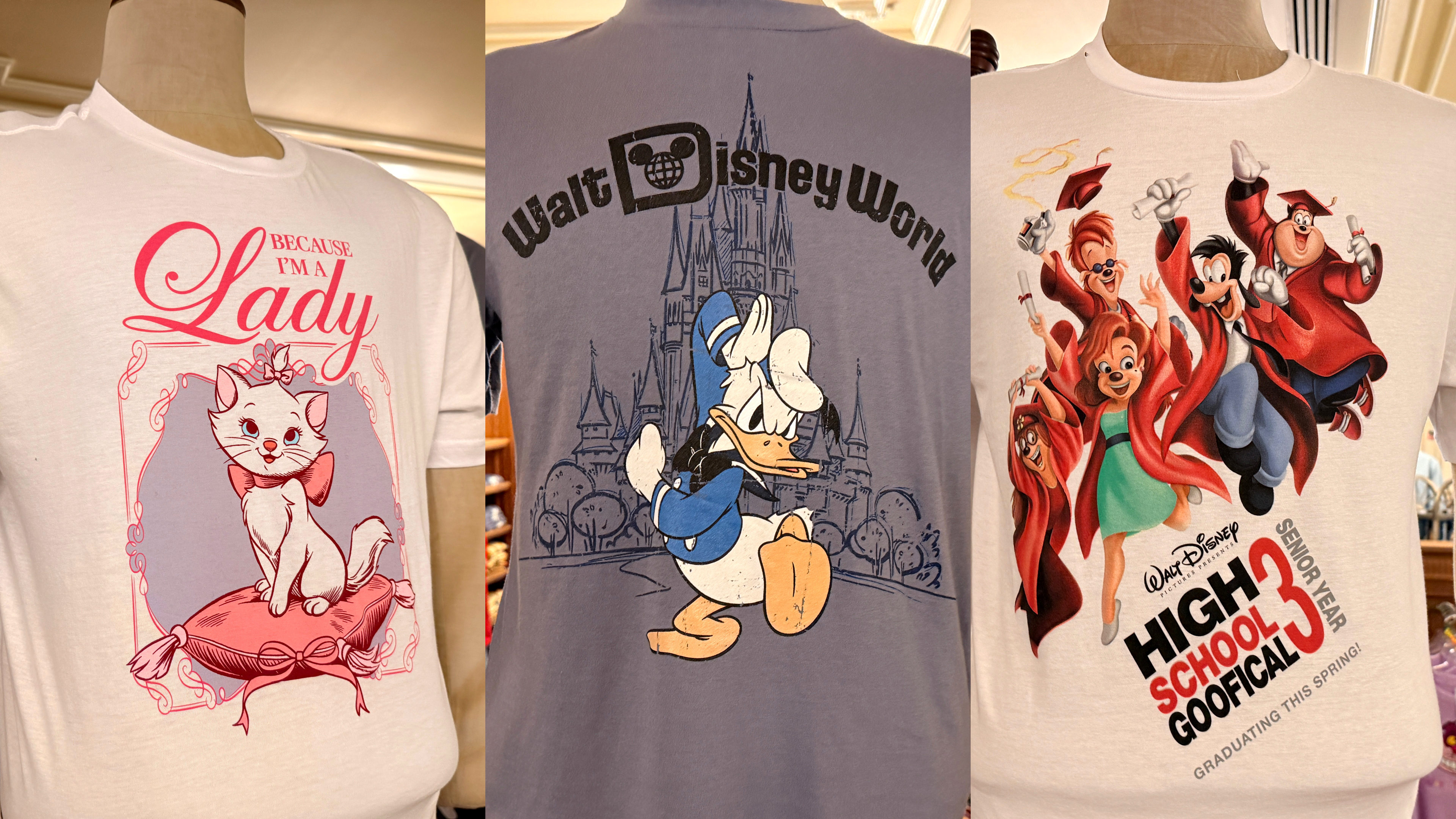 - These shirts feature a variety of characters, such as Marie from The Aristocats, Lizzie McGuire, Donald Duck and more.