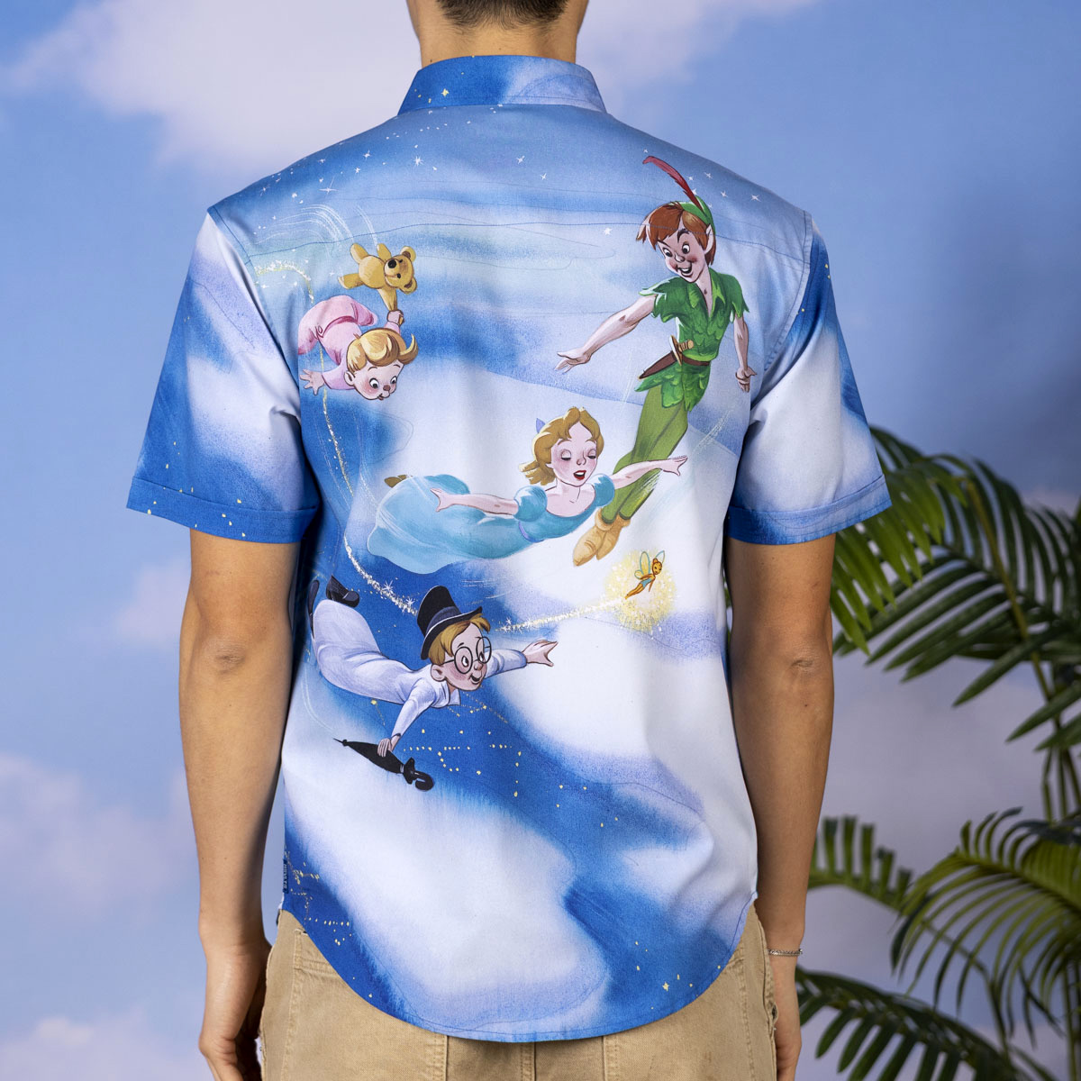The lineup features a colorful palette decorated with characters and icons from Disney's animated classic, and the standout piece is "Faith, Trust & Pixie Dust,” a full-panel button down of Peter and Darling children (Wendy, Michael, and John), flying across the sky. Another fun offering is "Hook’d It," a blue shirt covered in nautical elements like pirate ships, flags, mermaids, anchors, and more. Of course, Captain Hook and Mr. Smee are here too, and each icon is presented in the stylings of a tattoo!