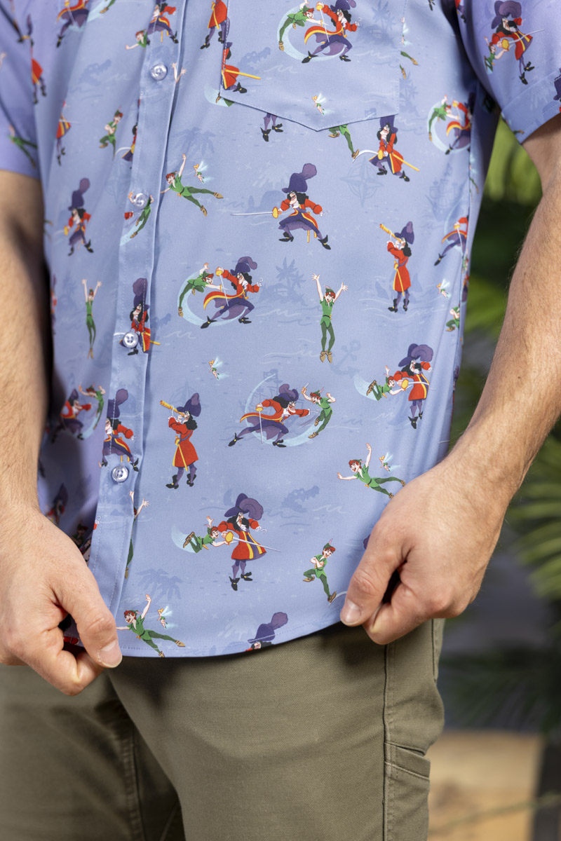 The lineup features a colorful palette decorated with characters and icons from Disney's animated classic, and the standout piece is "Faith, Trust & Pixie Dust,” a full-panel button down of Peter and Darling children (Wendy, Michael, and John), flying across the sky. Another fun offering is "Hook’d It," a blue shirt covered in nautical elements like pirate ships, flags, mermaids, anchors, and more. Of course, Captain Hook and Mr. Smee are here too, and each icon is presented in the stylings of a tattoo!