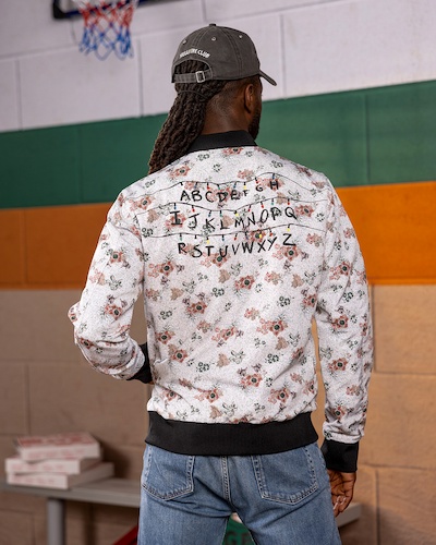 The reversible bomber jacket is a hellish landscape on one side, while the other gives us more demogorgons, and Joyce Byers’ clever string light-alphabet setup for communicating with Will in the Upside Down.