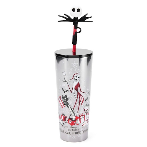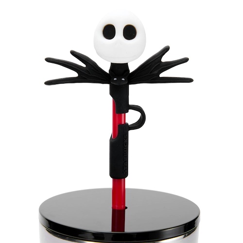 - “This travel tumbler from Starbucks® features a Jack Skellington straw topper, complete with bat bow tie. The built-in straw means all chills and no spills!"