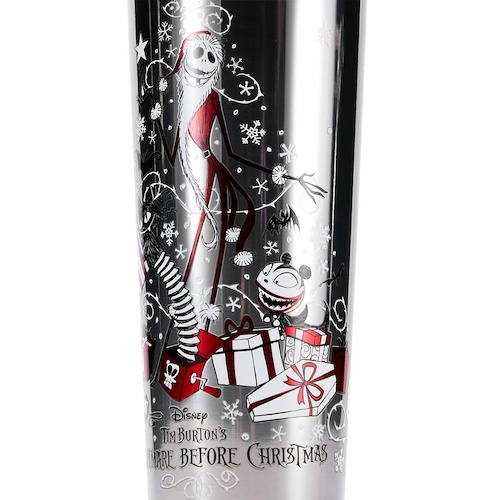 - Jack Skellington is featured on this silver stainless steel tumbler dressed up as Sandy Claws. He’s surrounded by a collection of presents and a spiraling tree. The tumbler comes with a screw top lid, red reusable straw, and silicone Jack straw cover to protect your beverage between sips.